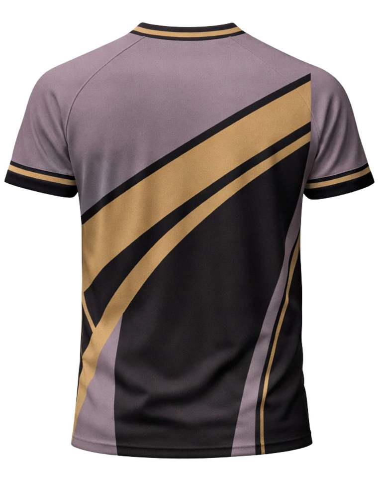 เสื้อโปโลผู้ชายสีน้ำเงินและสีเทา แขนสั้น พิมพ์ลายกราฟิก สวมใส่สบาย ระบายอากาศได้ดี ผลิตจากโพลีเอสเตอร์ เหมาะสำหรับกีฬากอล์ฟ เทนนิส และการฝึกซ้อม