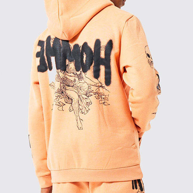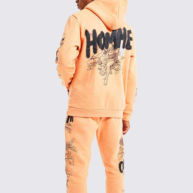 ชุดเซ็ตแทรคสูทพิมพ์ลายพัฟฟ์สำหรับผู้ชาย เสื้อฮู้ดดี้และกางเกงขายาวผ้าเฟรนช์เทอร์รี่ทรงโอเวอร์ไซส์ ผู้ผลิตชุดแทรคสูท