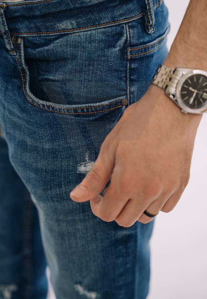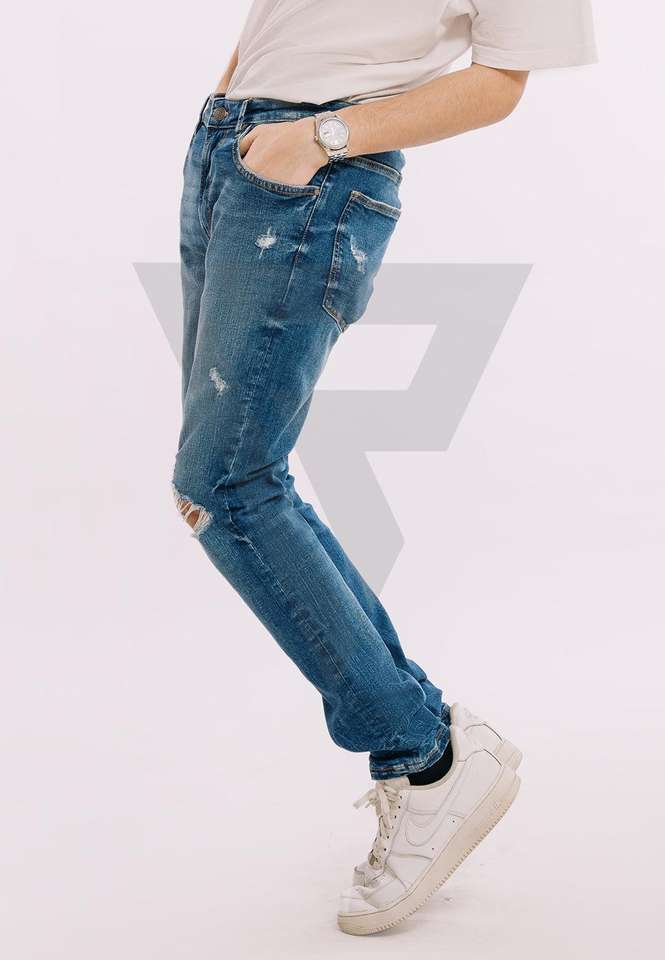 กางเกงยีนส์เข้ารูปพอดีตัวสำหรับผู้ชายกางเกงเอวสูงผ้าเดนิมสีฟ้ามีซิปด้านหน้าแบบลำลอง