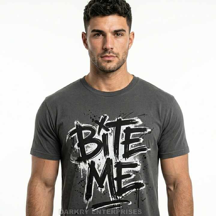 เสื้อยืดผู้ชายสีเทาพิมพ์ลายกราฟิกข้อความ BITE ME สไตล์สตรีทแวร์ ผ้าฝ้ายคุณภาพสูง ผลิตจำนวนมาก