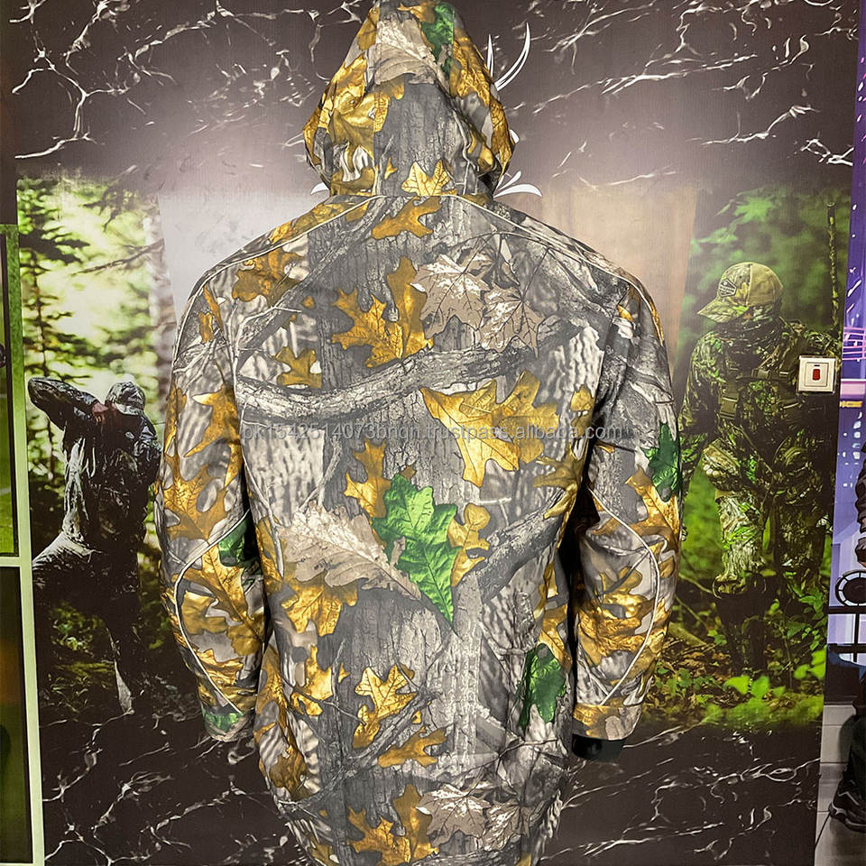 เสื้อแจ็คเก็ตยุทธวิธีลายพรางแบบยูนิเซ็กซ์สำหรับการล่าสัตว์ บุซับในนุ่ม หน้าอกมีซิป 2 ช่อง กันน้ำ กันลม ผ้าคอร์ดูร่า มีฮู้ด แข็งแรงทนทาน