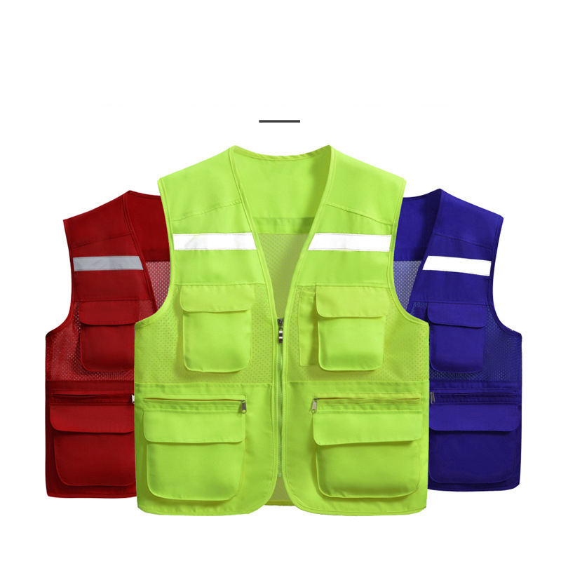 เสื้อกั๊กสะท้อนแสงแบบตาข่ายสำหรับผู้ชาย เสื้อแจ็คเก็ตสำหรับทำงาน เสื้อผ้าสำหรับงานก่อสร้าง เสื้อกั๊กนิรภัยสะท้อนแสงพร้อมกระเป๋าและโลโก้