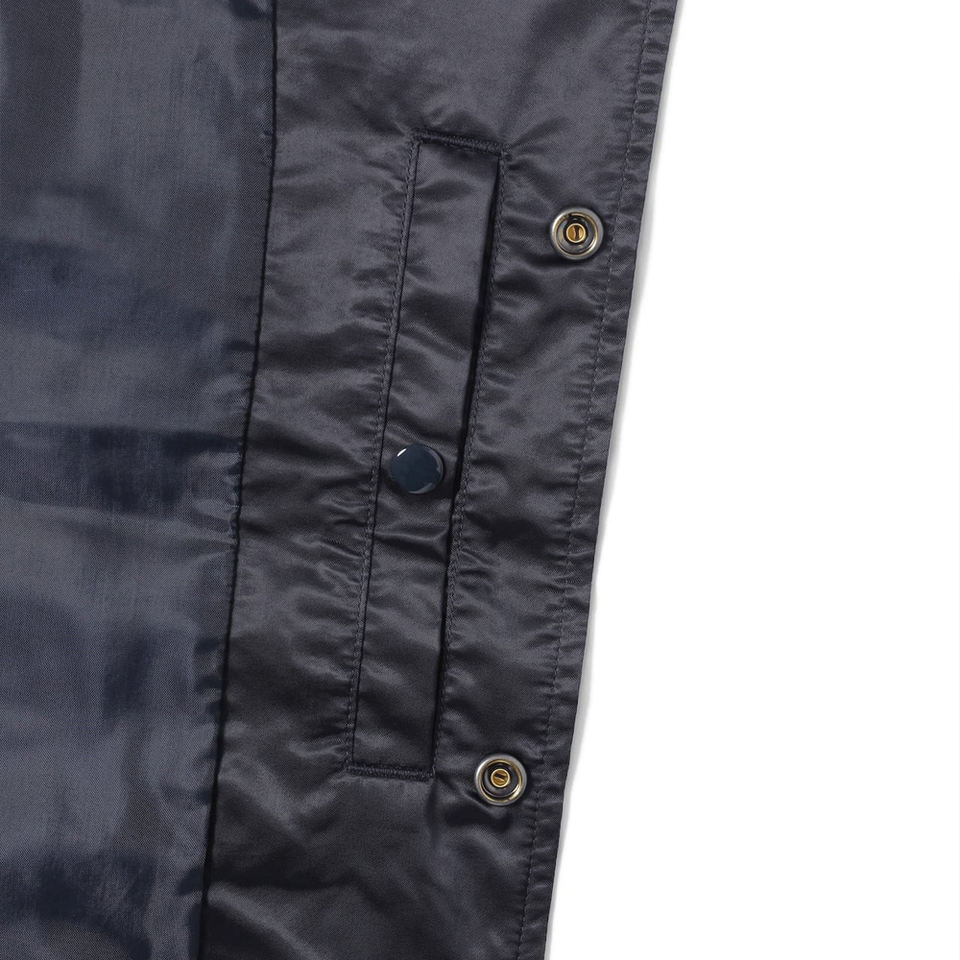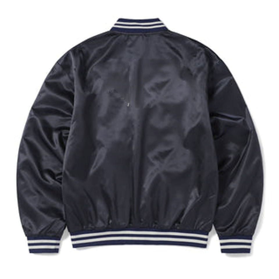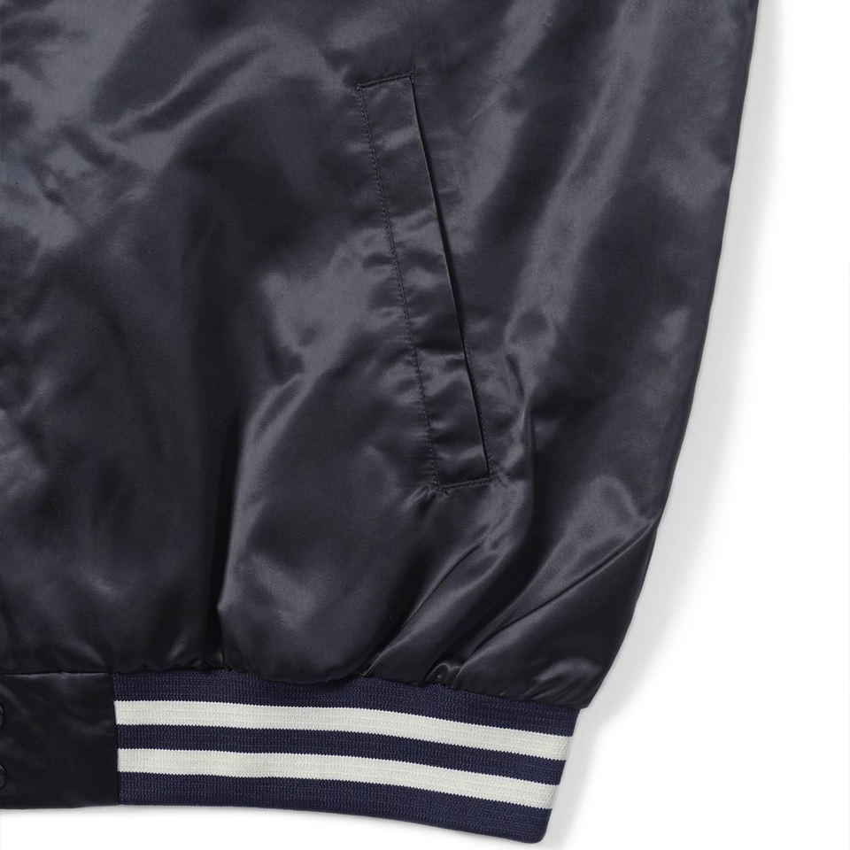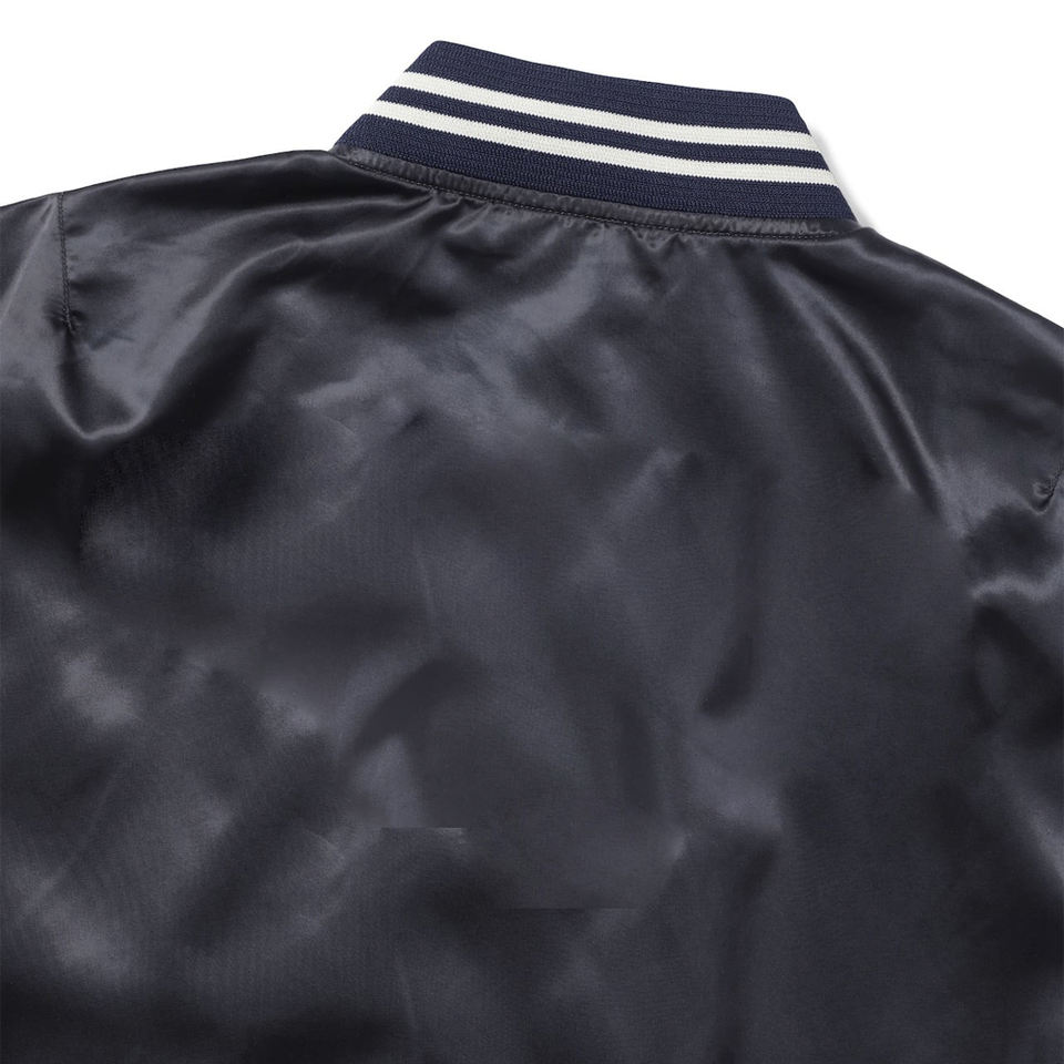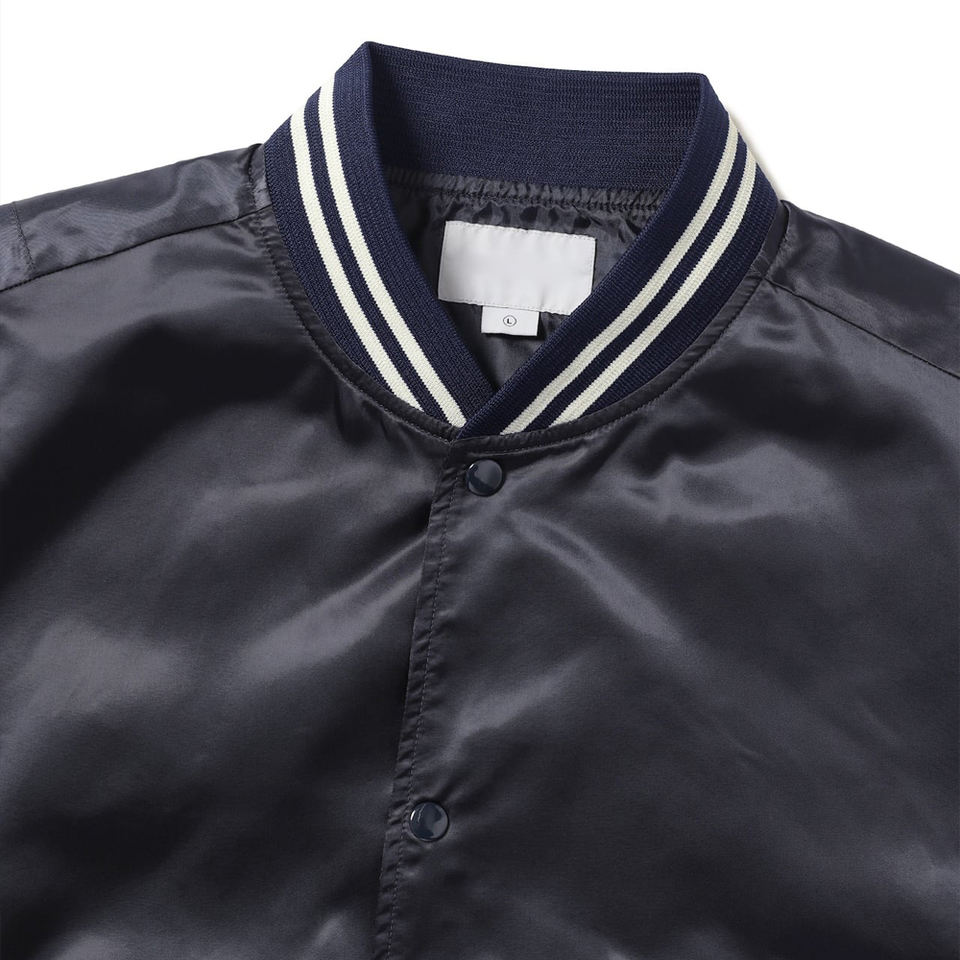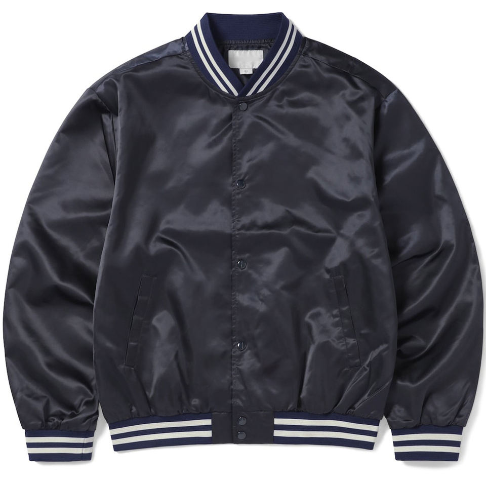 เสื้อแจ็คเก็ตวาร์ซิตี้ผ้าซาตินสีน้ำเงินกรมท่าสำหรับผู้ชาย แจ็คเก็ตเบสบอลคลาสสิกแบบมีกระดุมแป๊ก แจ็คเก็ตเลตเตอร์แมนผ้าไหมเงาสีน้ำเงินเข้ม