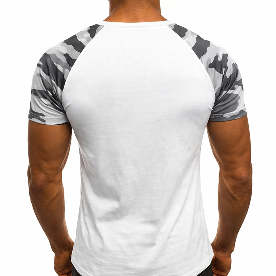 เสื้อยืดแขนแร็กแลนผู้ชายสั่งทำพิเศษ สีขาวตัวเสื้อ ลายพรางแขนเสื้อ | เสื้อยืดกีฬาแบบเข้ารูป | ผู้ผลิตจำนวนมาก