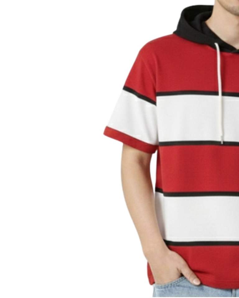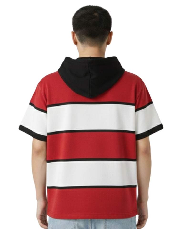 เสื้อฮู้ดแขนสั้นลายทางสีแดงขาวดำสำหรับผู้ชาย พร้อมฮู้ดแบบมีเชือกผูกและกระเป๋าเสื้อ สไตล์ลำลองแนวสตรีทแวร์ เหมาะสำหรับฤดูร้อน