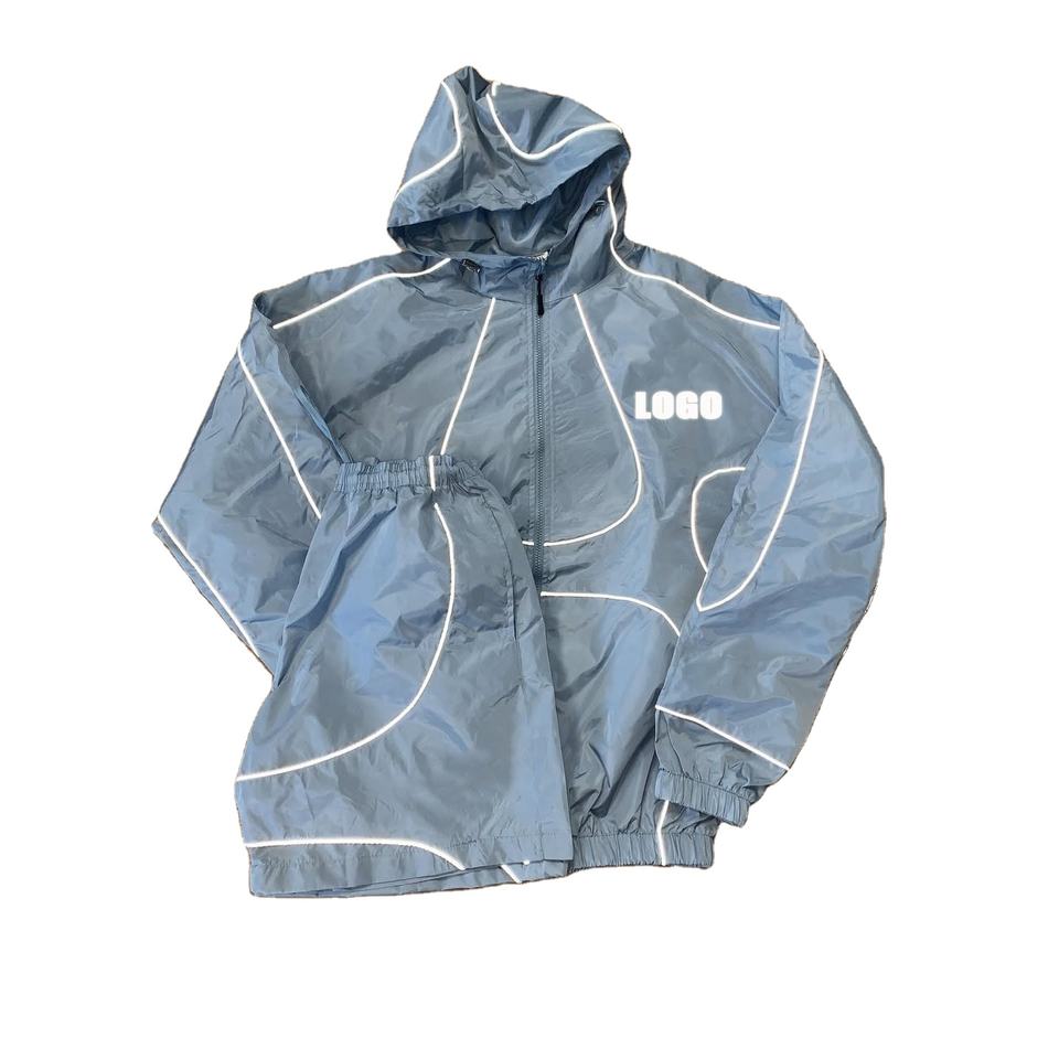ชุดวิ่งผู้ชายแบบกำหนดเอง เสื้อแจ็คเก็ตกันลมแบบมีซิปสะท้อนแสง ชุดกีฬา โพลีเอสเตอร์ ไนลอน เสื้อแจ็คเก็ตวิ่งและกางเกงขาสั้น