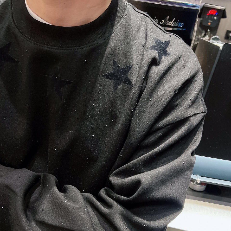 เสื้อสเวตเตอร์คอกลมแขนยาวสำหรับผู้ชายเสื้อฮู้ดติดพลอยเทียมแขนยาวพิมพ์ลายดาวสำหรับผู้ชาย