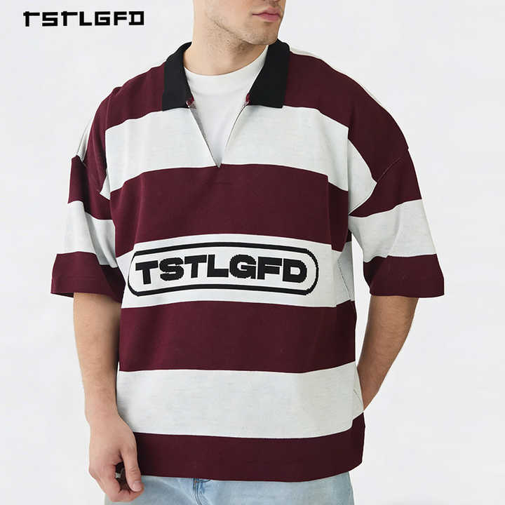 เสื้อยืดคอกว้างแขนสั้นทรงหลวมลายทางสไตล์สตรีทแวร์สำหรับผู้ชาย รับผลิตแบบ OEM/ODM จัดส่งรวดเร็ว