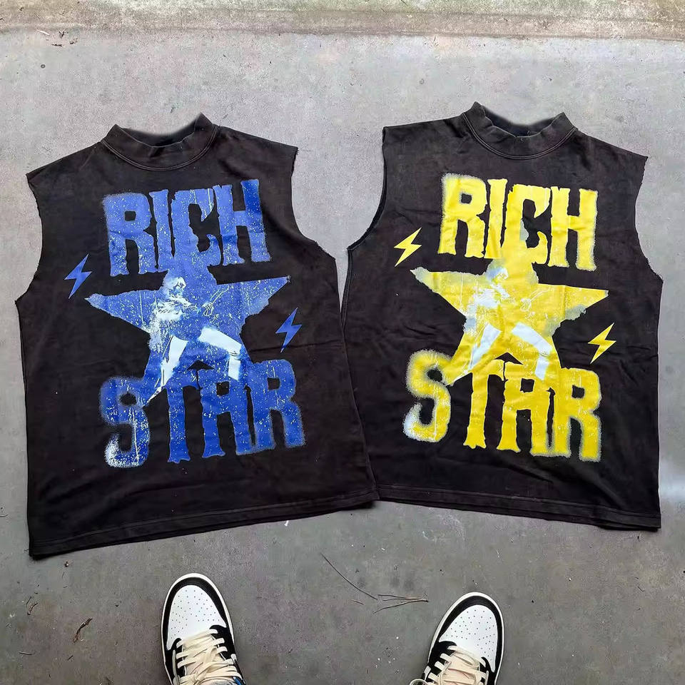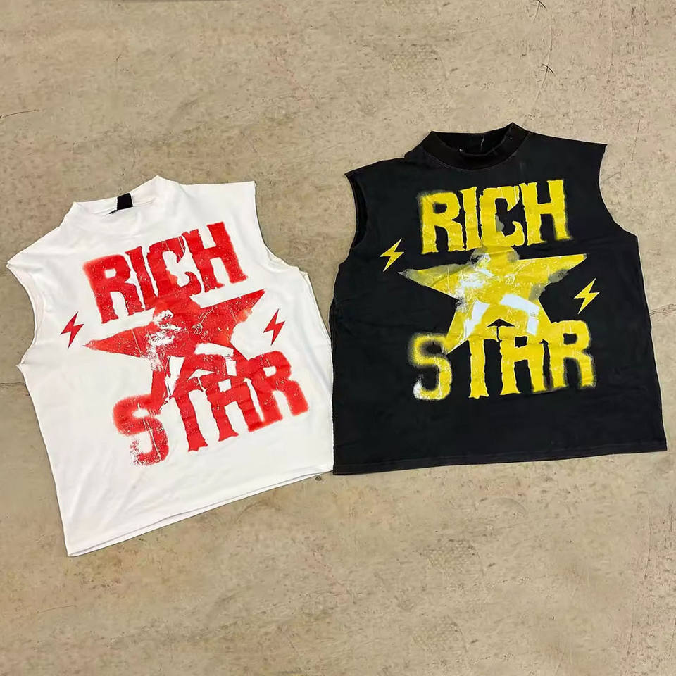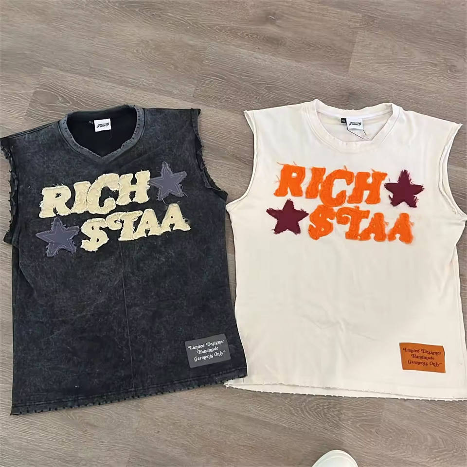 เสื้อยืดแขนกุดสำหรับผู้ชายเสื้อยืดซักสไตล์สตรีทปักด้วยผ้าคอตตอน100% งานปัก