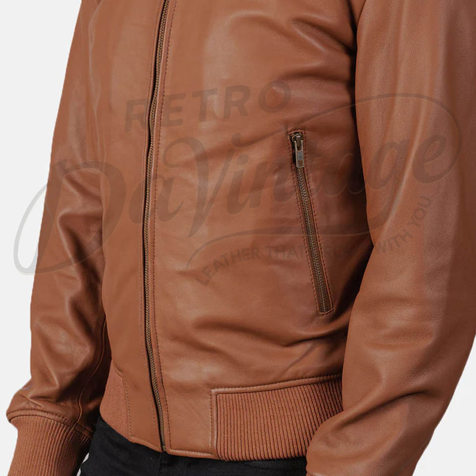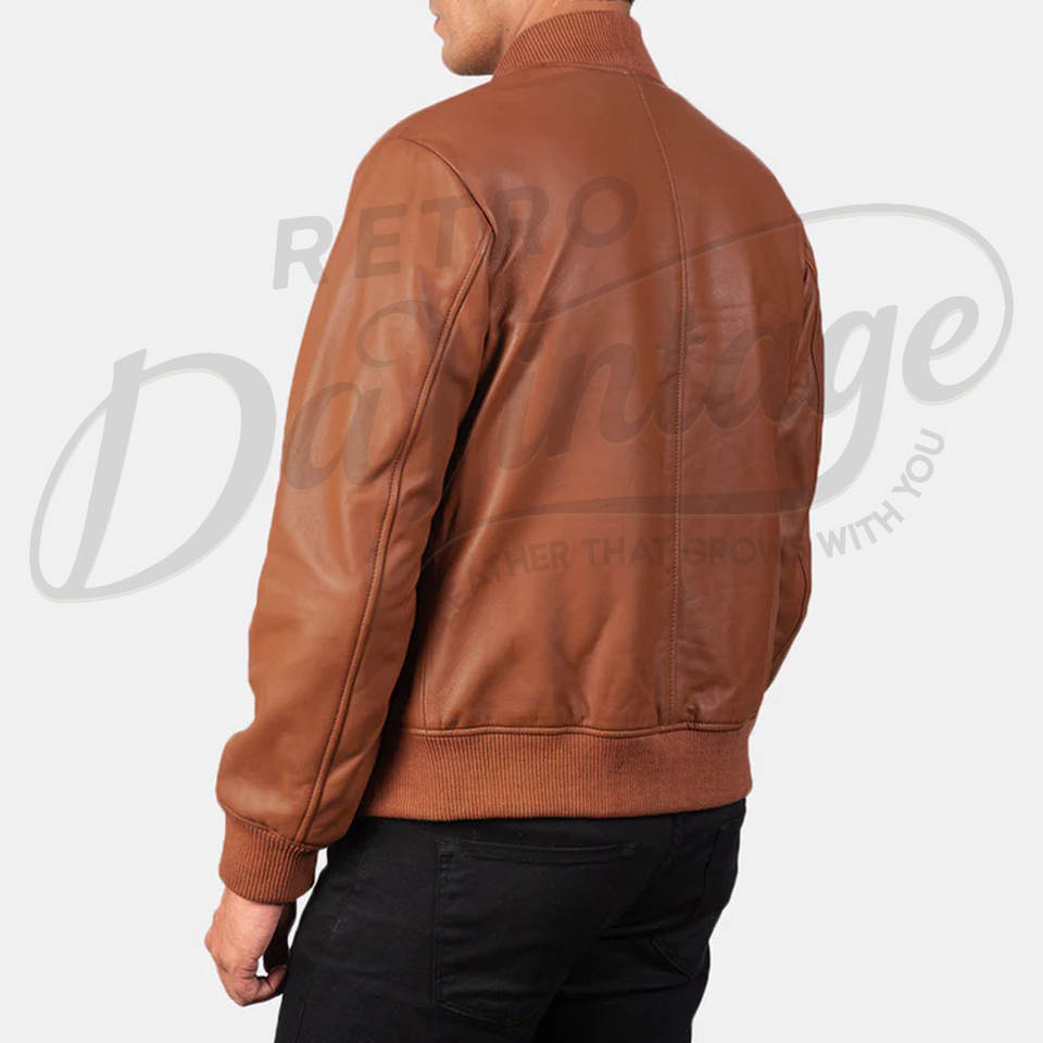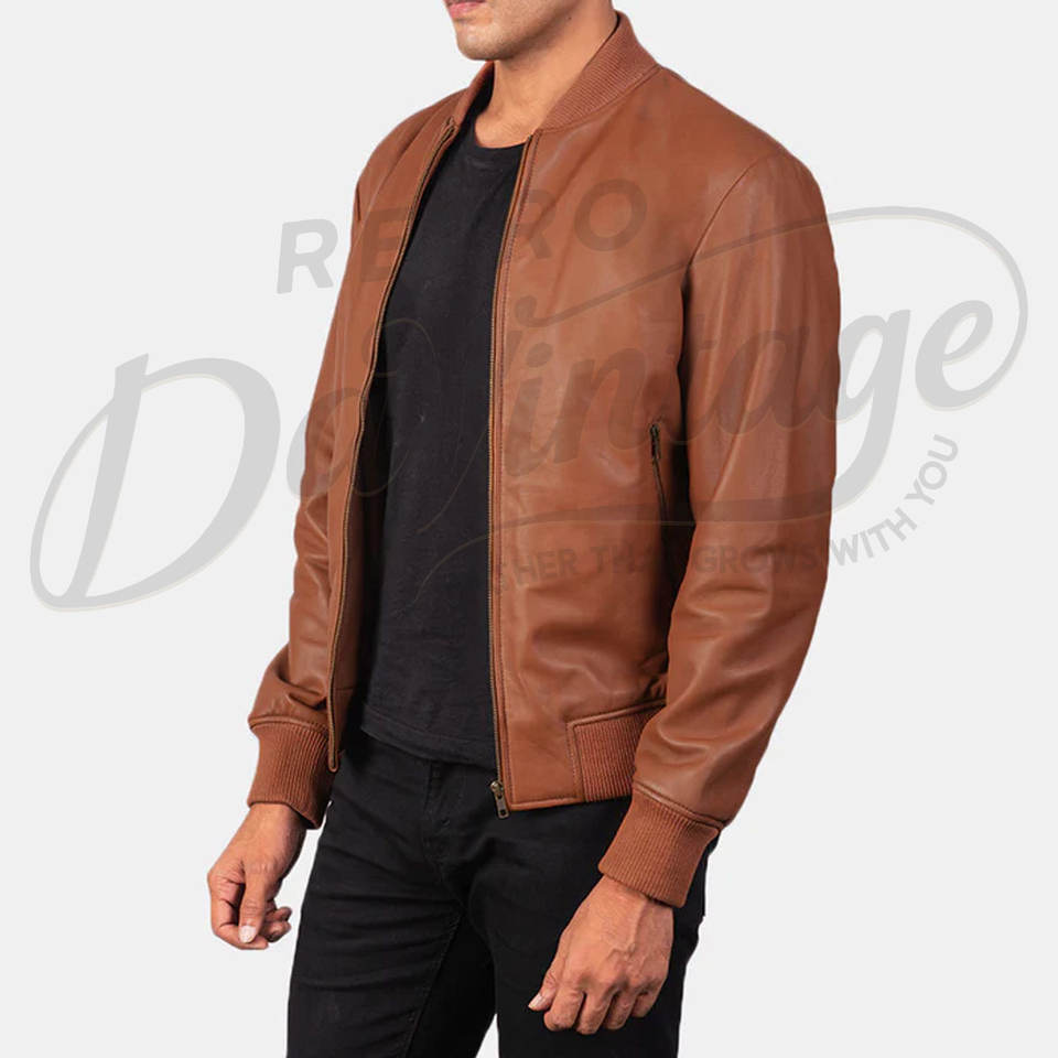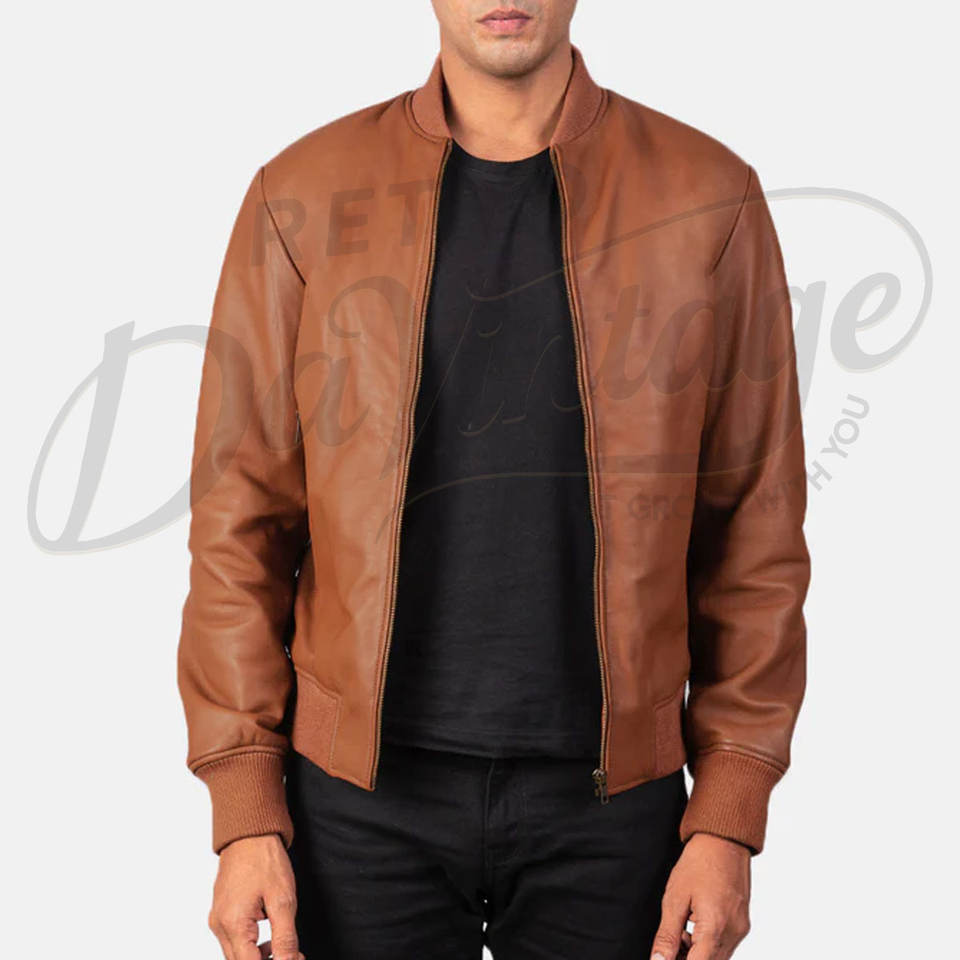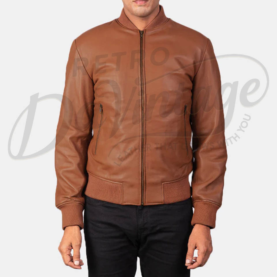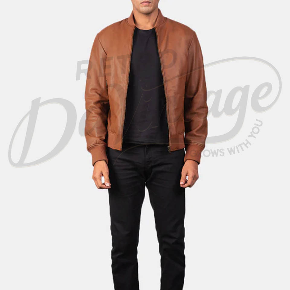 แจ็คเก็ตหนังแท้ทรงบอมเบอร์สำหรับผู้ชาย สีแทน ดีไซน์เรียบง่าย ซิปหน้า คอเบสบอล ทรงเข้ารูป สไตล์ลำลอง