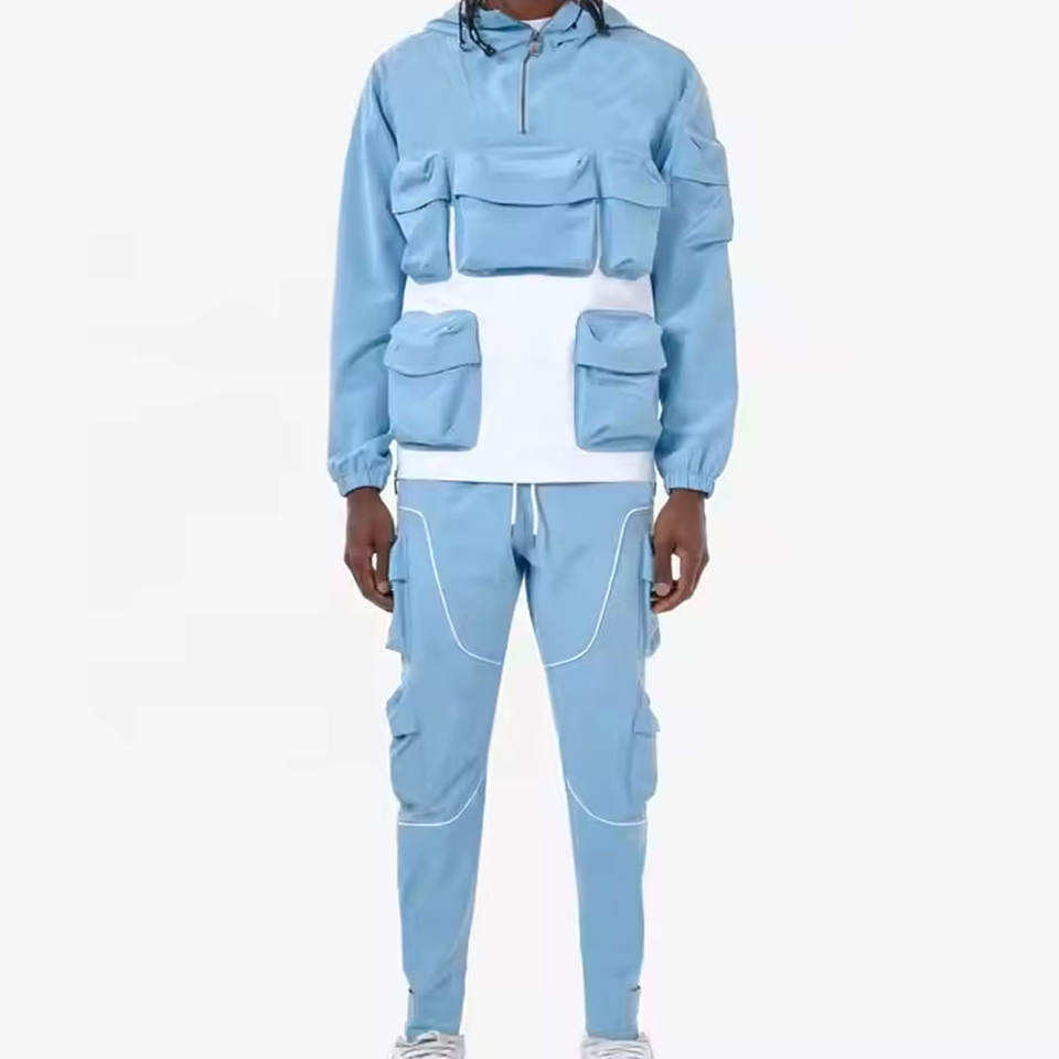ชุดเสื้อแจ็คเก็ตมีฮู้ดและกางเกงจ็อกเกอร์แบบทหาร 2 ชิ้น สไตล์สตรีทแวร์ สำหรับผู้ชาย พร้อมกระเป๋าหลายช่อง แบบกันลม