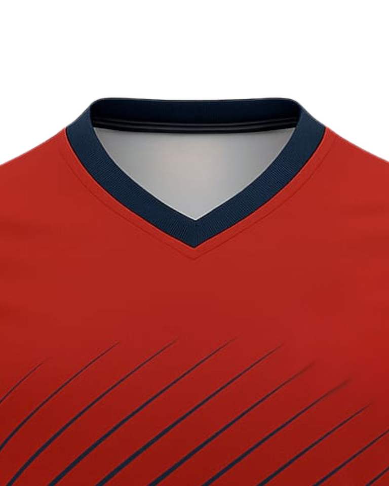 เสื้อยืดคอวีพิมพ์ลายไล่สีสำหรับผู้ชาย ผ้าโพลีเอสเตอร์ สีแดงกรมท่า ชุดกีฬา ระบายอากาศ แห้งเร็ว รับทำโลโก้ ขายส่งจากโรงงาน