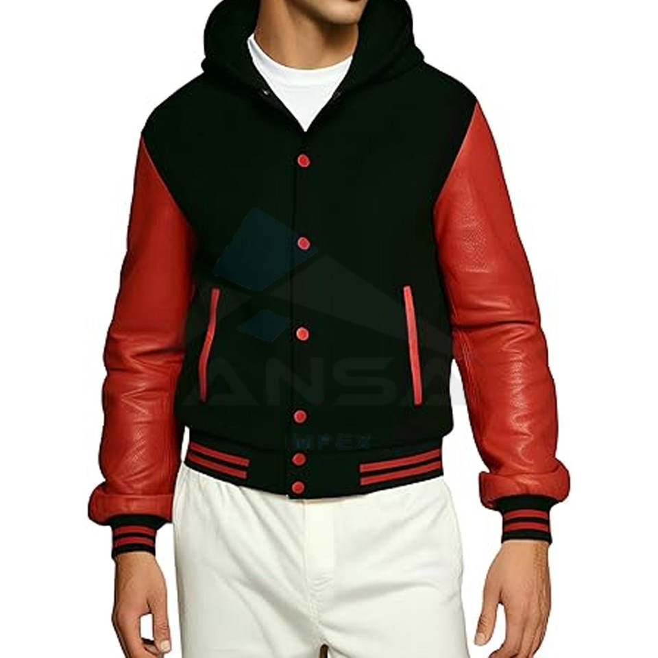 เสื้อแจ็คเก็ตเลตเตอร์แมนแบบกำหนดเองสำหรับผู้ชาย แขนหนังแท้ ตัวเสื้อทำจากผ้าขนสัตว์ แต่งขอบยางยืด สวมใส่สบาย สีดำแดง มีฮู้ด