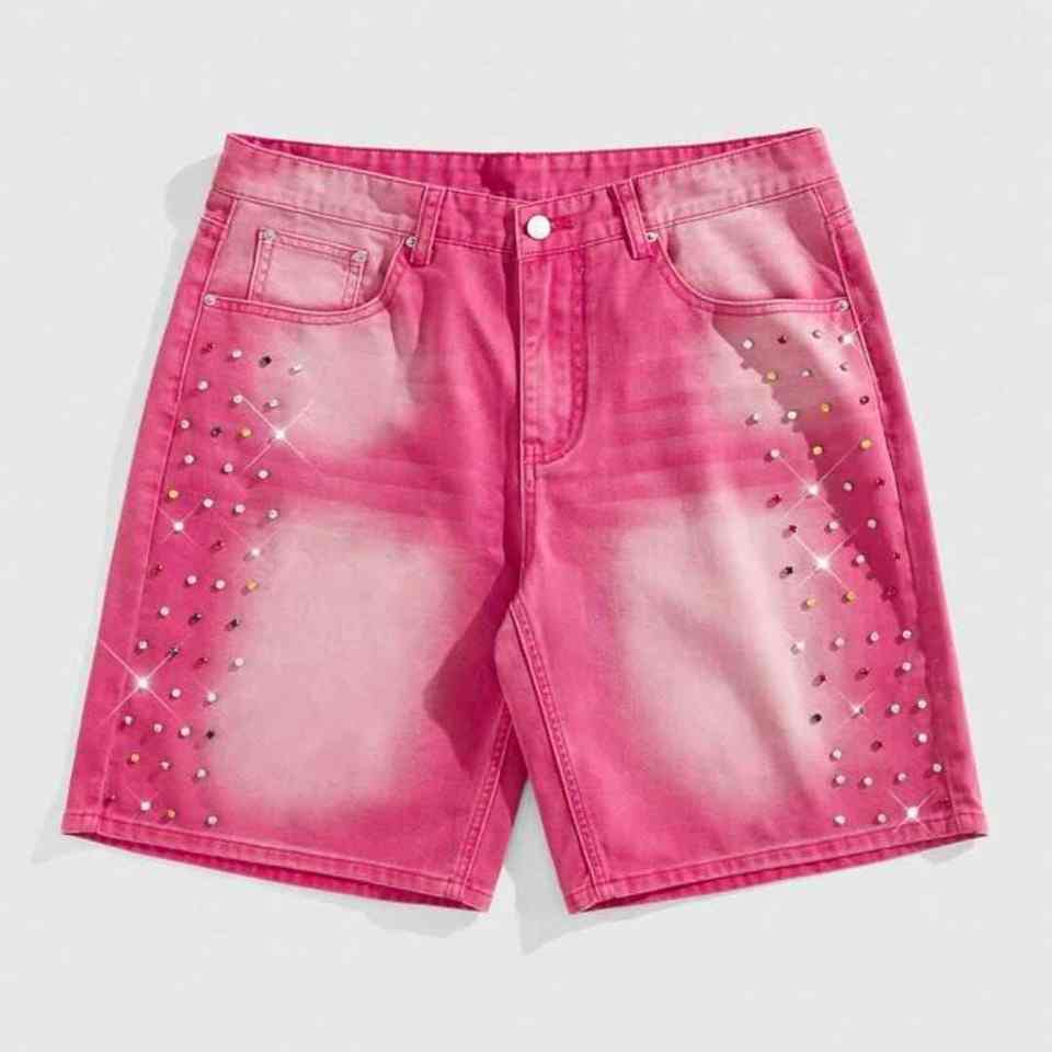 กางเกงยีนส์ขาสั้นผู้ชายสไตล์วินเทจ สำหรับฤดูร้อน ทรงลำลอง เอวกลาง ระบายอากาศได้ดี แห้งเร็ว ผ้าฝ้าย 100% ขอบดิบ ตกแต่งซิปและคริสตัล