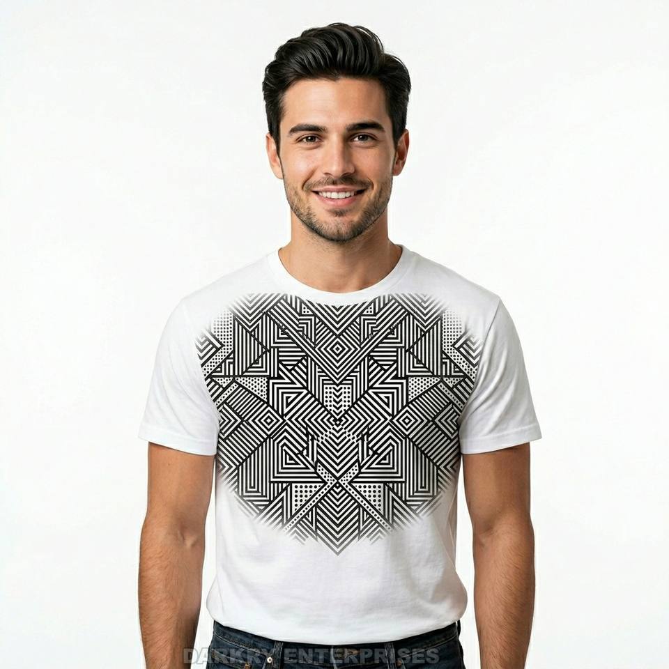 เสื้อยืดผู้ชายสีขาว 100% ผ้าฝ้าย ลายเรขาคณิต พิมพ์ลายกราฟิกแบบซับลิเมชั่น เสื้อยืดสกรีนลาย สไตล์ลำลอง เสื้อผ้าสตรีทแวร์