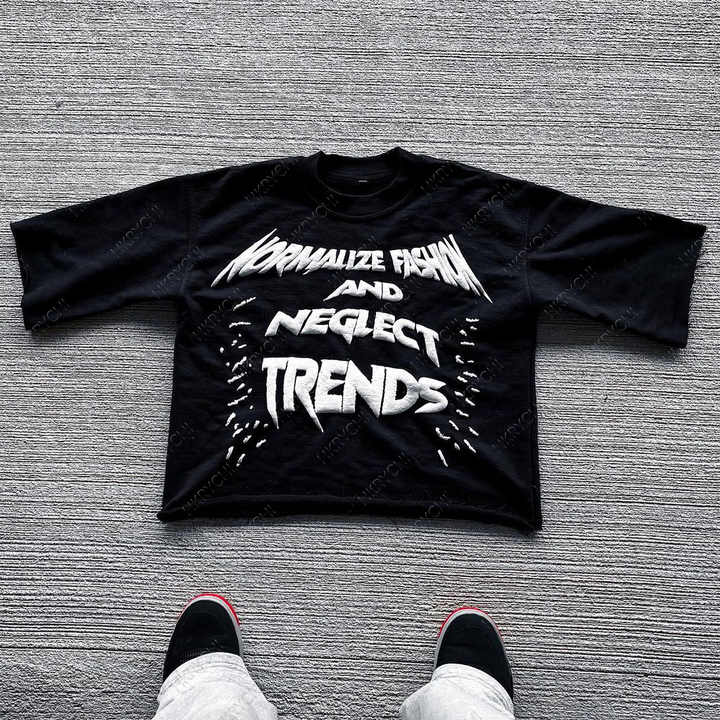 เสื้อยืดโอเวอร์ไซส์ผู้ชายผ้าฝ้าย 100% ตัดขอบดิบ ล้างสีแบบแอซิด ทรงครอป บ็อกซี่ 3 มิติ สไตล์วินเทจ