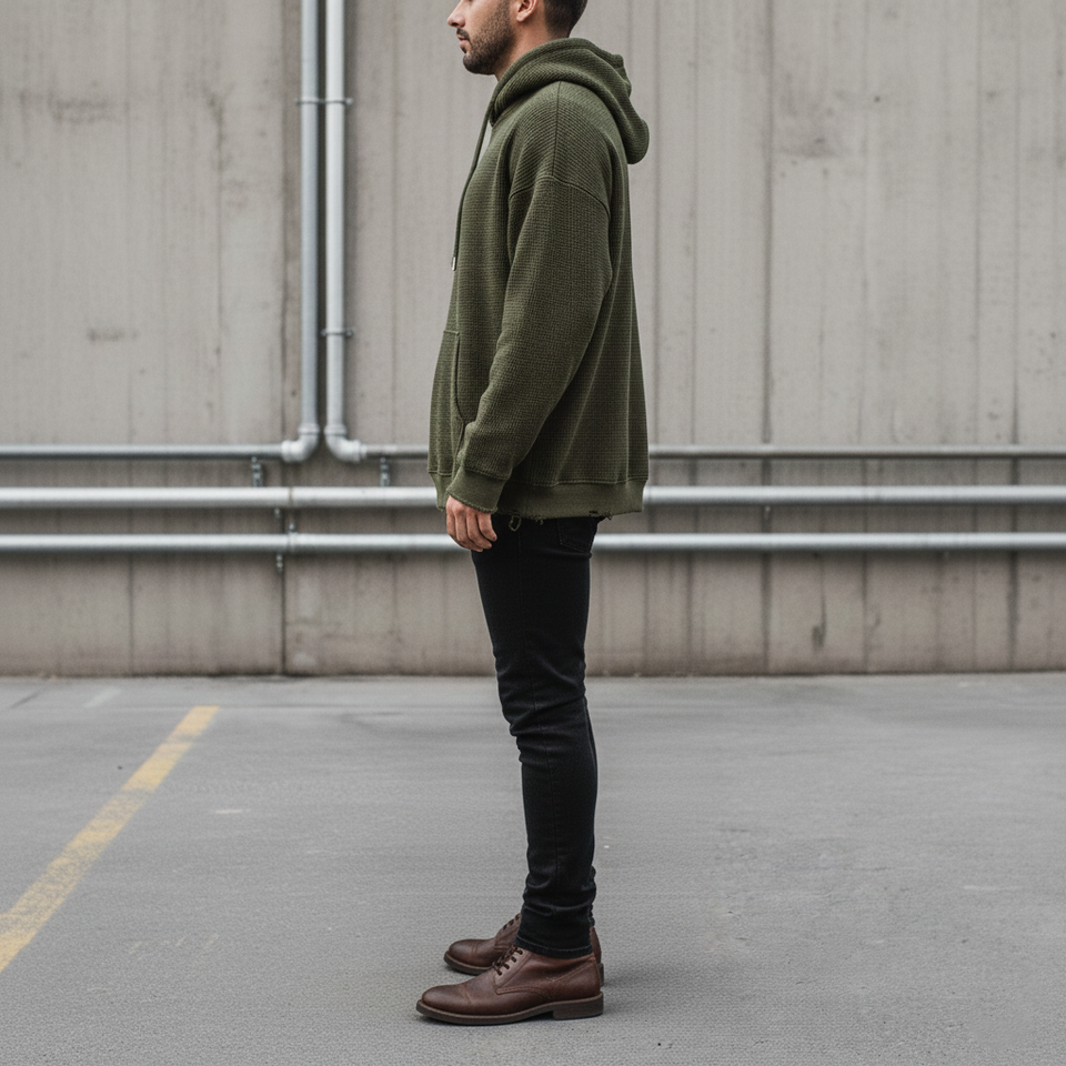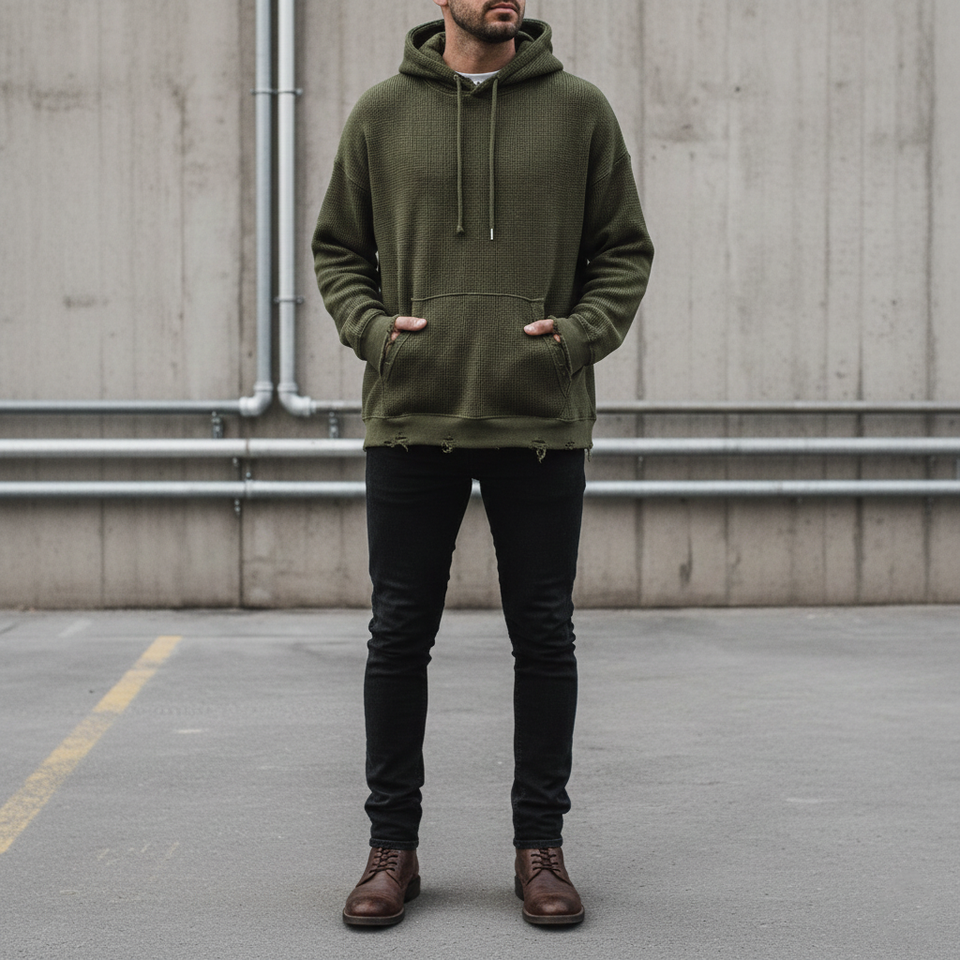 เสื้อฮู้ดดี้ผู้ชายผ้าฟลีซเนื้อนุ่มสีเขียวมะกอก 360 กรัม สไตล์สตรีทแวร์แบบดิสเทรส ทรงปกติ มีช่องสำหรับนิ้วโป้งที่ข้อมือ