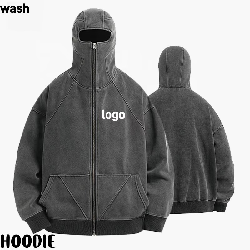 เสื้อฮู้ดดี้ผู้ชายแบบซิปเต็มตัว ลวดลายฟอกสีสไตล์วินเทจ พร้อมดีไซน์กระเป๋าแบบมีรูตา สไตล์หนักแน่น คล้ายหน้ากากคลุมหน้าแบบวินเทจ