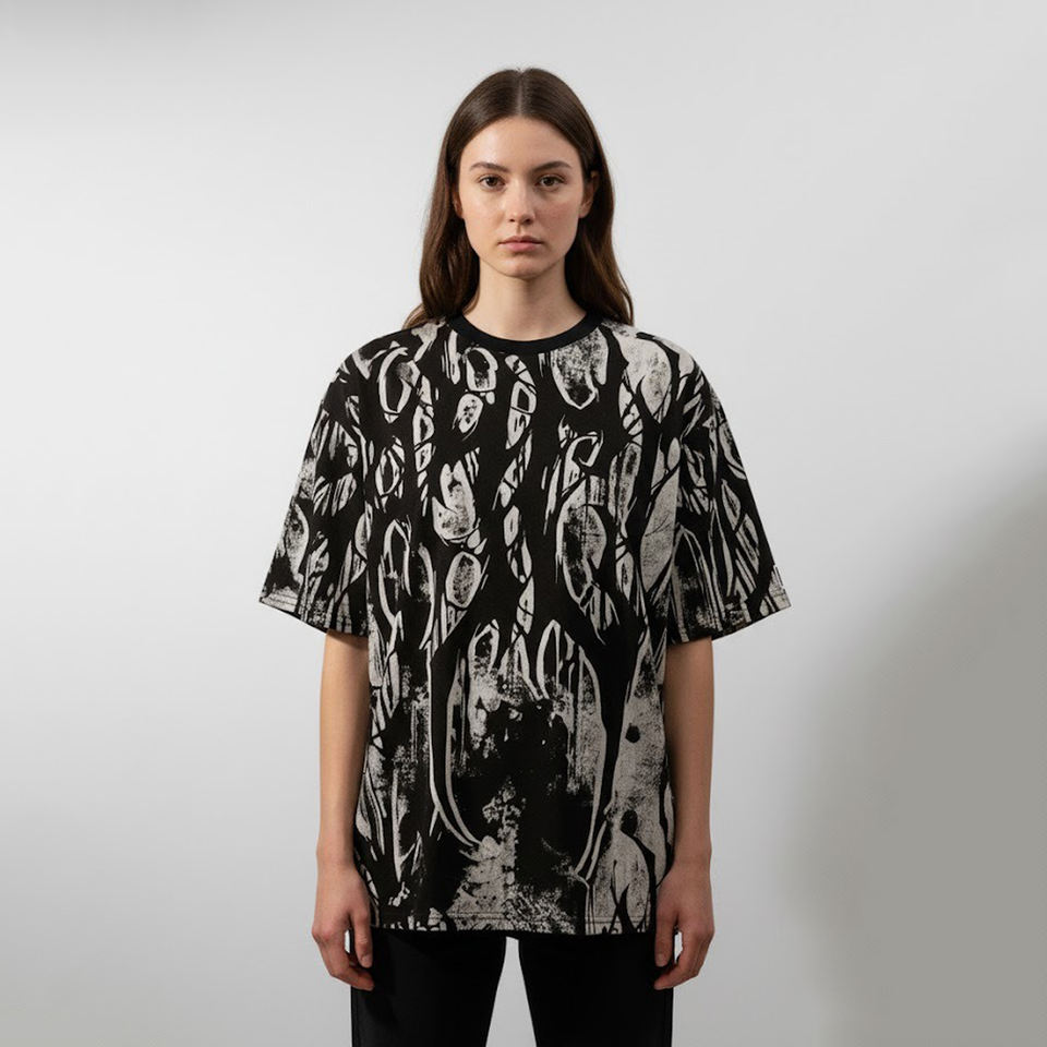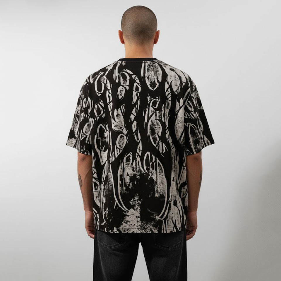 เสื้อยืดผู้ชายพิมพ์ลายกราฟิกทั้งตัว สีดำขาว สไตล์กรันจ์ สตรีทแวร์ ผ้าคอตตอนหนา ทรงโอเวอร์ไซส์ วินเทจ ลุคซักยีนส์ แขนสั้น