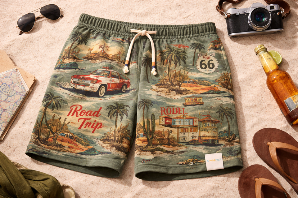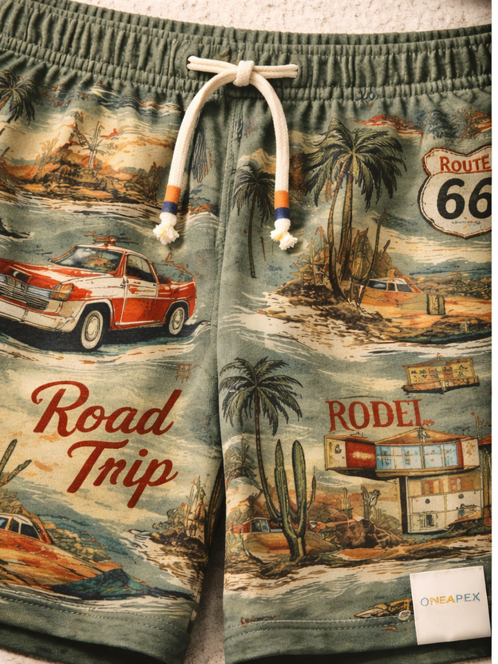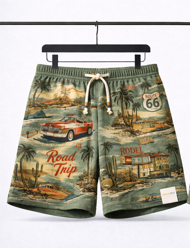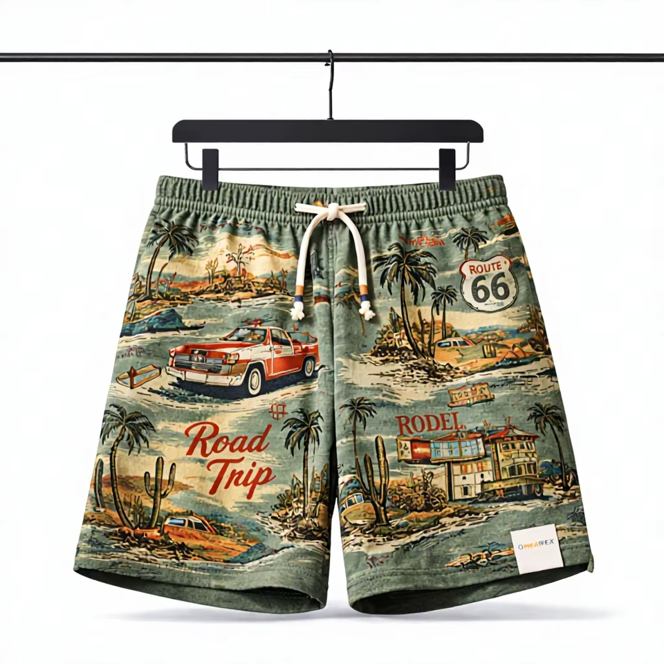 กางเกงชายหาดผู้ชายแบบสั่งทำพิเศษ – กางเกงขาสั้นลำลองพิมพ์ลายวินเทจเอวยางยืดพร้อมเชือกผูก (สีเขียวมะกอก)