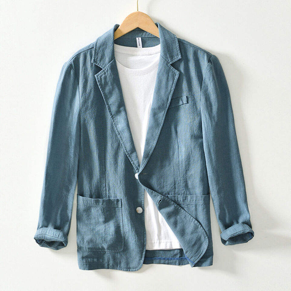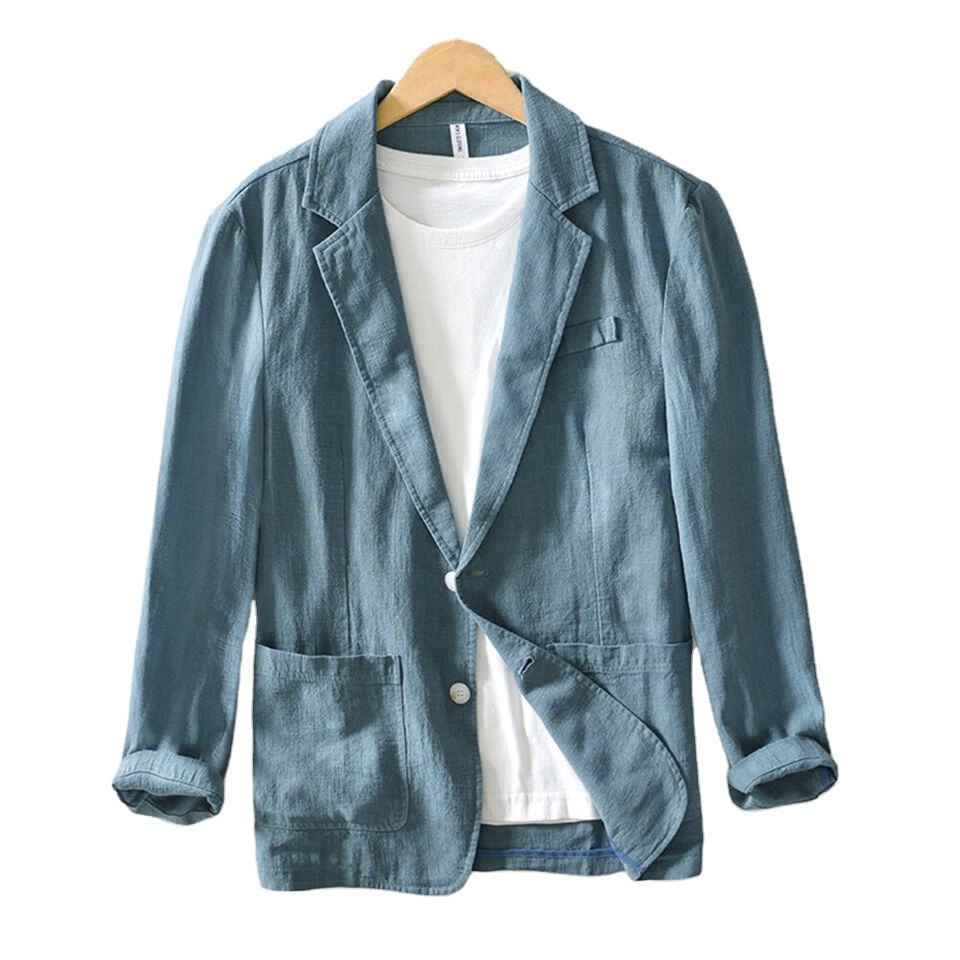 เสื้อแจ็คเก็ตผ้ายีนส์ของผู้ชายเสื้อสูทลำลองแบบยั่งยืนเสื้อเบลเซอร์ผ้ายีนส์เข้ารูปแบบกำหนดเอง