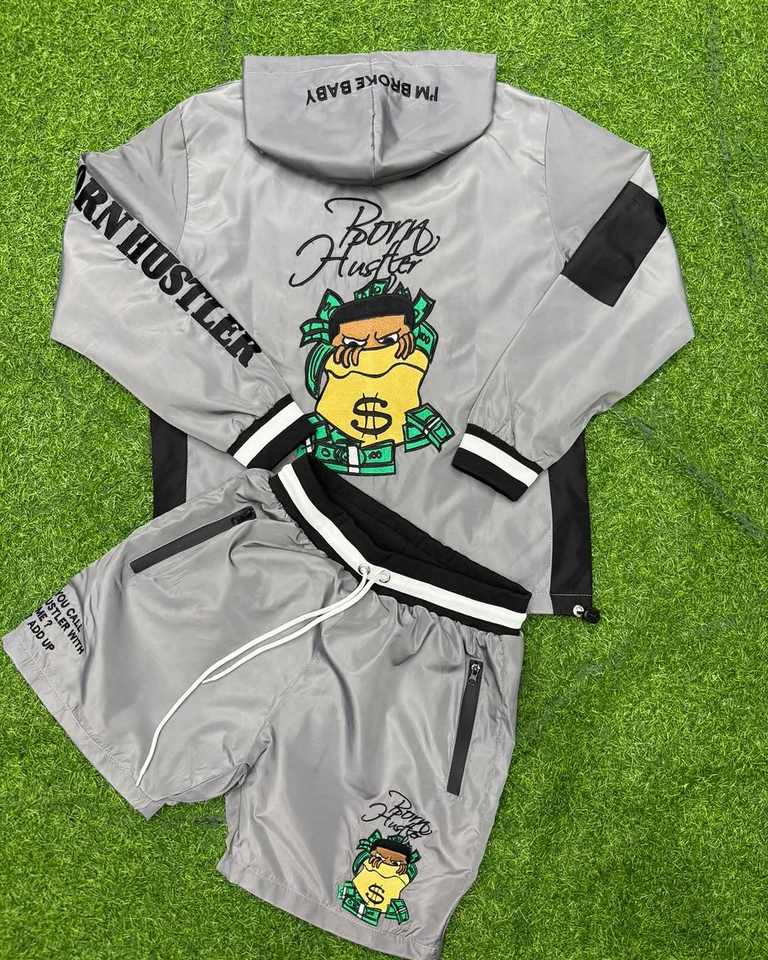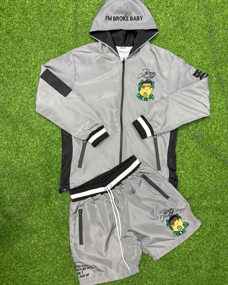 ชุดวอร์มแบบสั้นและแจ็กเก็ตของผู้ชายชุดวอร์มสองชิ้นมีซิปชุดวอร์มกันลมโพลีเอสเตอร์ออกแบบได้ตามต้องการ
