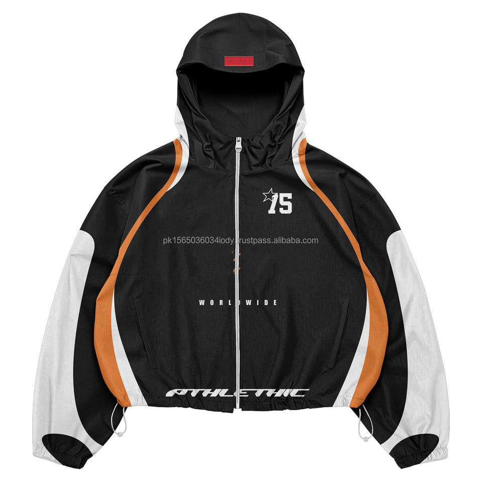 ชุดเซ็ตเสื้อแจ็คเก็ตและกางเกงขาสั้นผู้ชายแบบสั่งทำพิเศษ 2 ชิ้น ชุดวอร์มซิป โพลีเอสเตอร์ กันลม สตรีทแวร์
