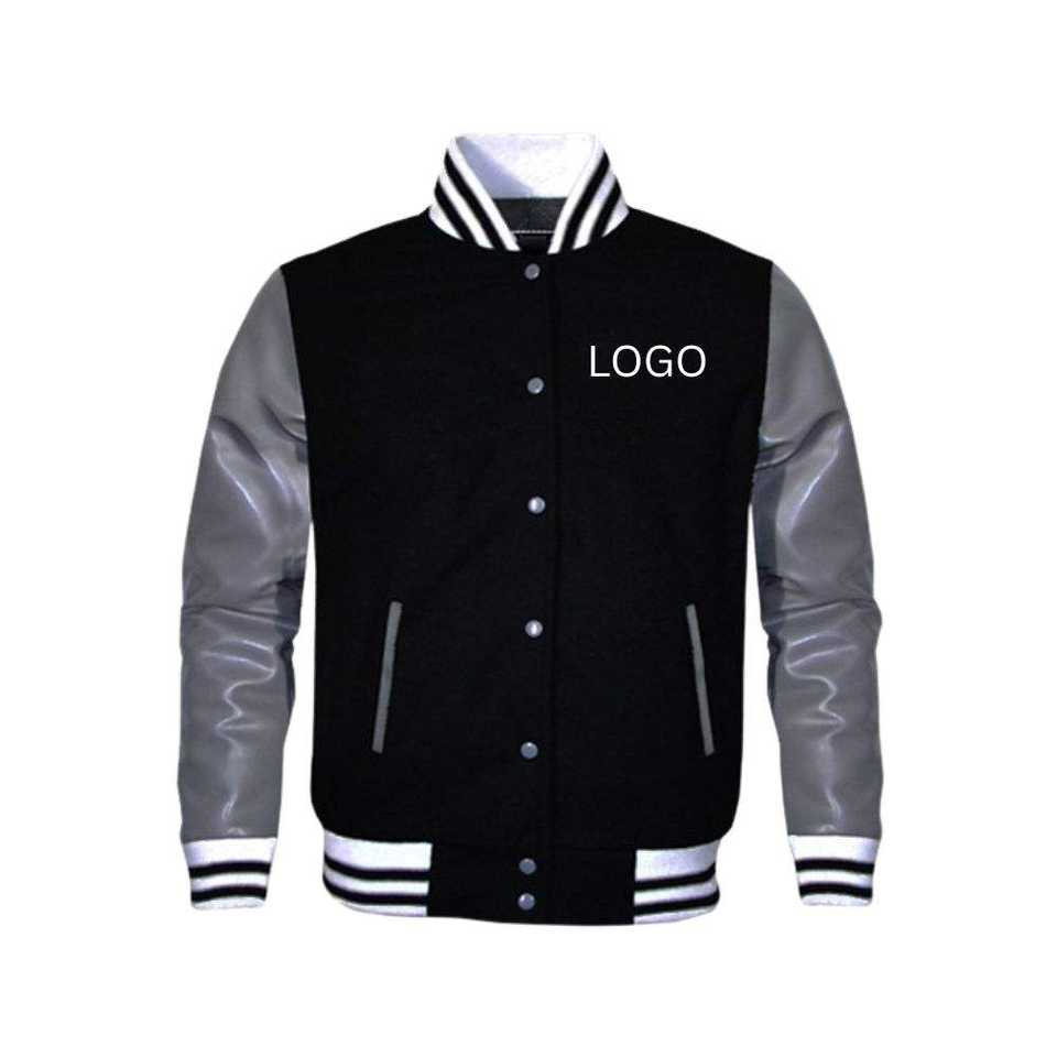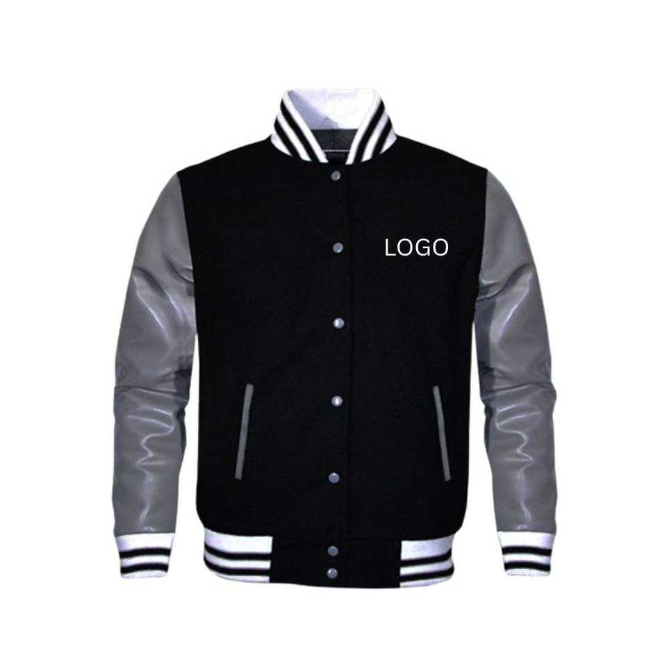 เสื้อแจ็กเก็ตมันตรามหาวิทยาลัยสำหรับผู้ชายเสื้อแจ็กเก็ตกันหนาวแขนหนังขนแกะและแผ่นปักลายด้วยผ้ากำมะหยี่คอตั้งโลโก้ด้านหน้า