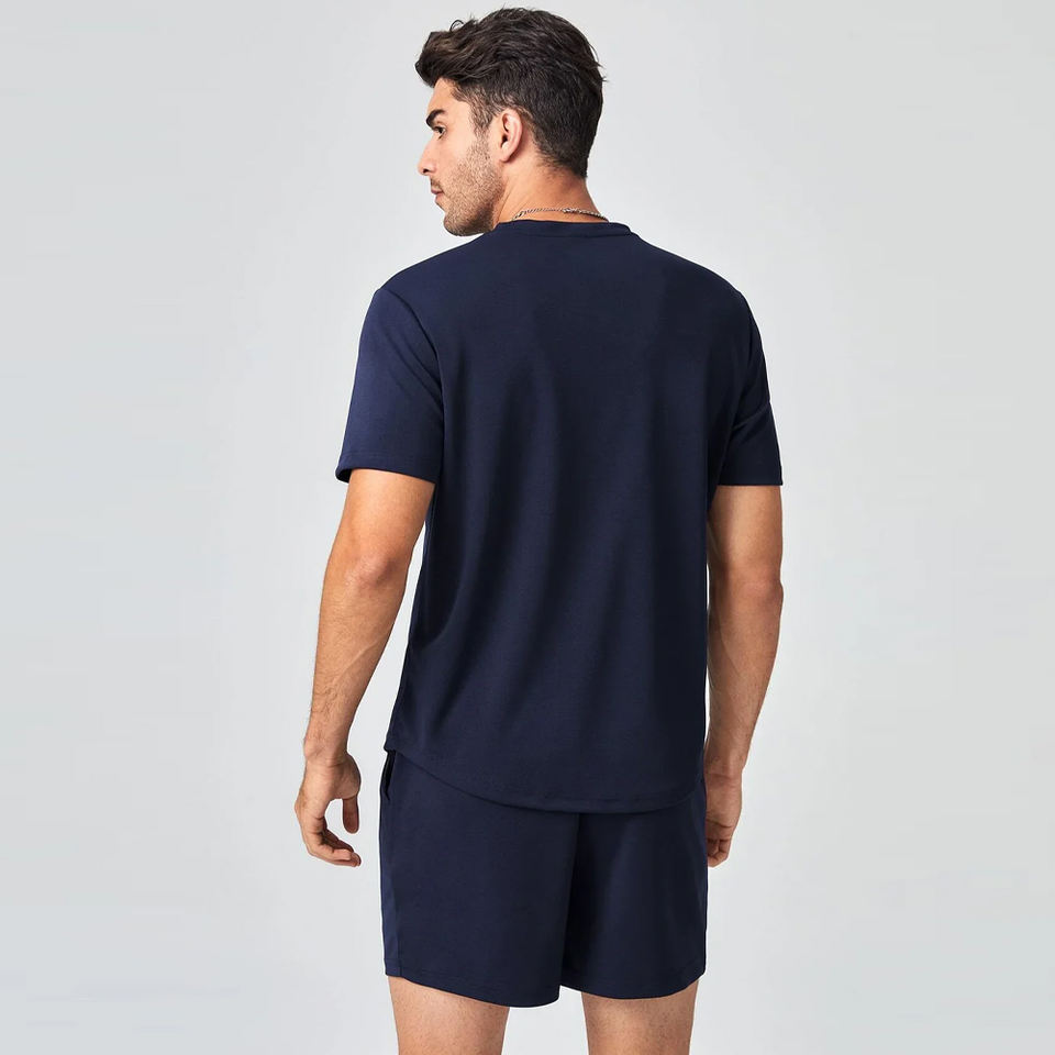 ชุดเสื้อยืดคอกลมสำหรับผู้ชายชุดกางเกงขาสั้นผ้าคอตตอนออร์แกนิกสำหรับ100% ชุดกางเกงขาสั้นชุดสูทแฝดแบบออกแบบได้ตามต้องการ