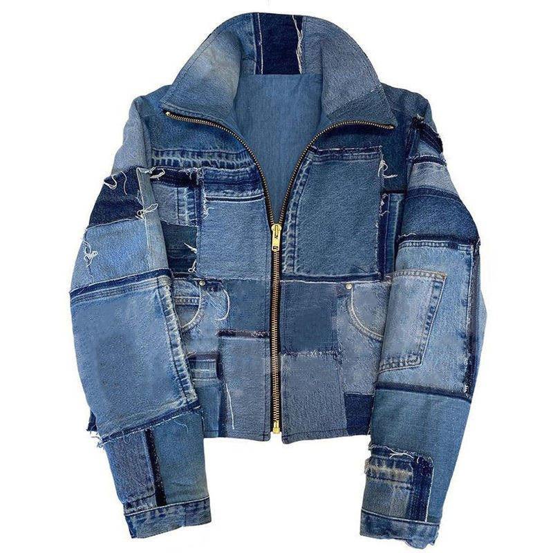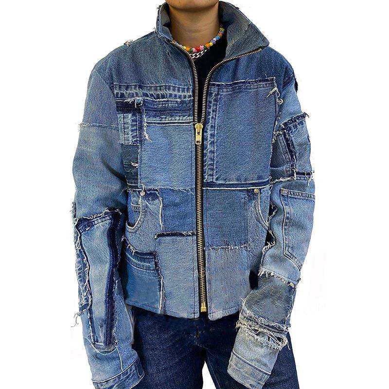 แจ็คเก็ตยีนส์ผู้ชายแบบสั่งทำพิเศษ คอตั้ง สไตล์สตรีทแวร์สำหรับฤดูหนาว ดีไซน์แบบแพทช์เวิร์ค ปิดด้วยซิป สียอดนิยม