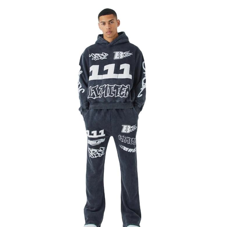 ชุดวอร์มผ้าปะติดสำหรับผู้ชายชุดวอร์มเสื้อฮู้ดและกางเกงซักกรดซีดแสงแดด