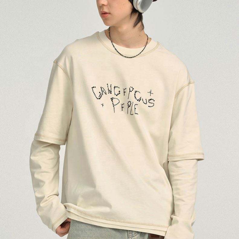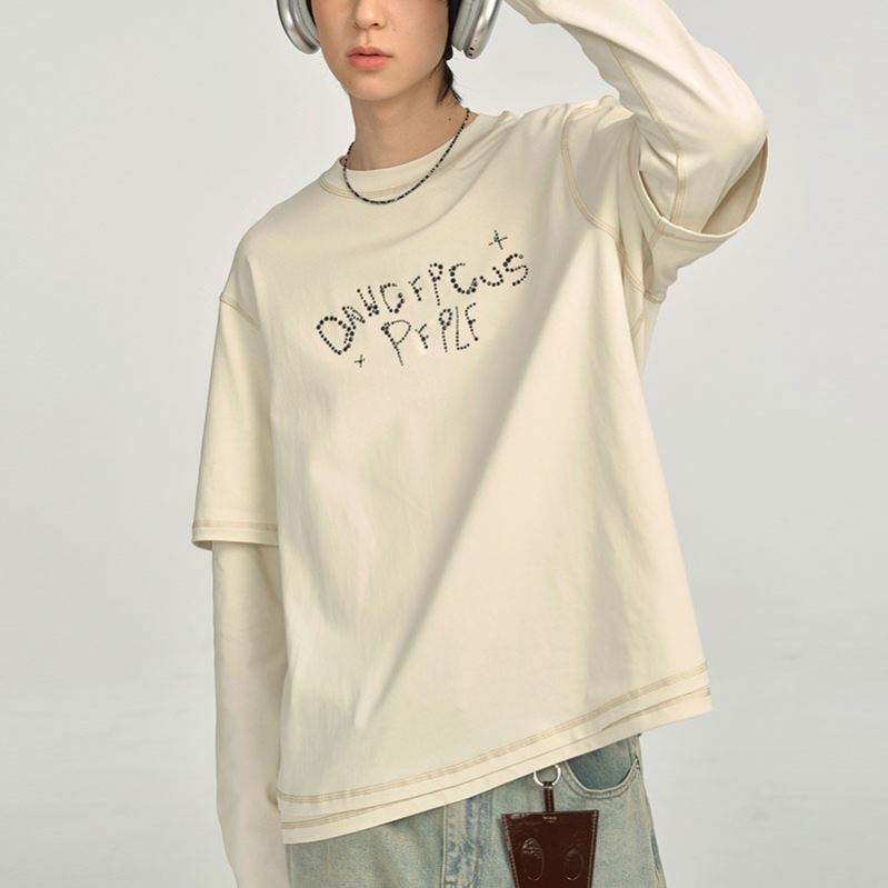 เสื้อยืดแขนยาวผู้ชายแบบสองชั้น ผ้าฝ้าย 100% สไตล์ลำลอง ทรงโอเวอร์ไซส์ พิมพ์ลายดิจิทัล ลายถักนิตติ้ง น้ำหนัก 180 กรัม