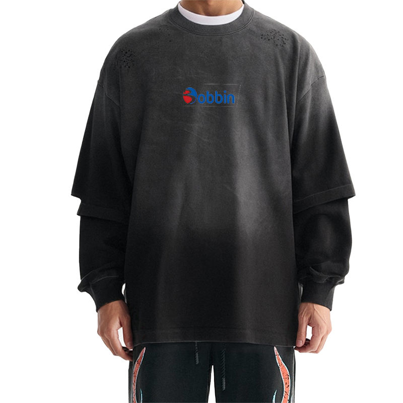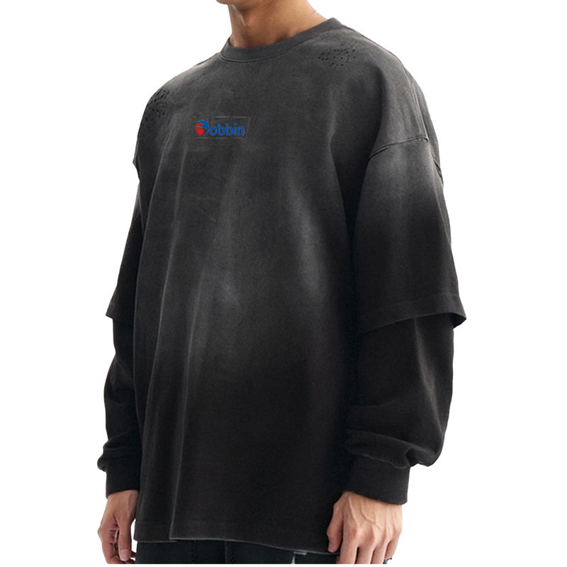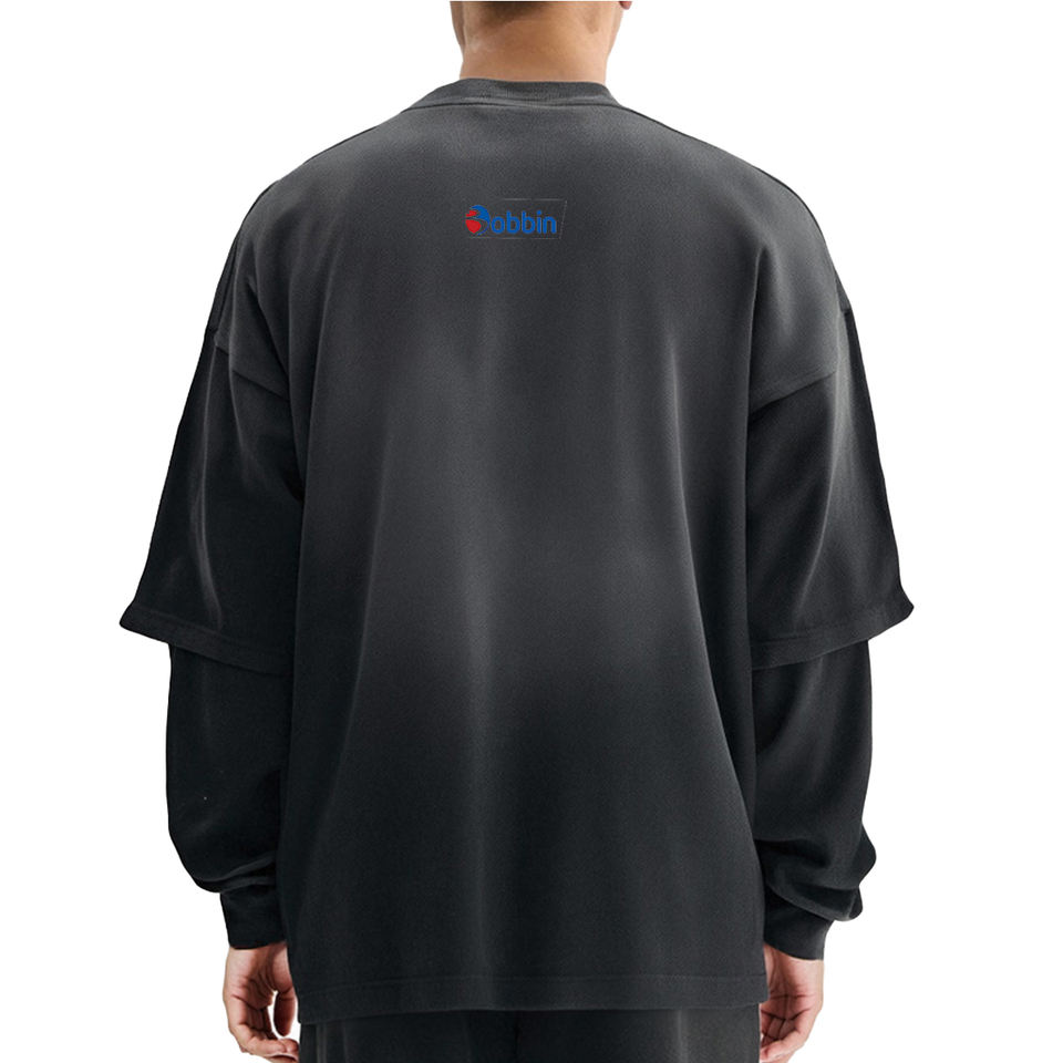 เสื้อยืดแขนยาวผู้ชายแบบสองชั้น พิมพ์ลายกราฟิกแตกแบบกรดฟอก สไตล์สตรีทแวร์ทรงโอเวอร์ไซส์ ลายเรียบ