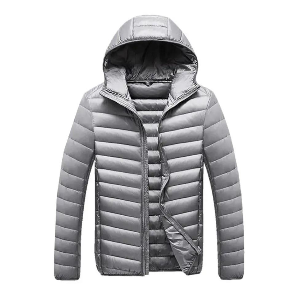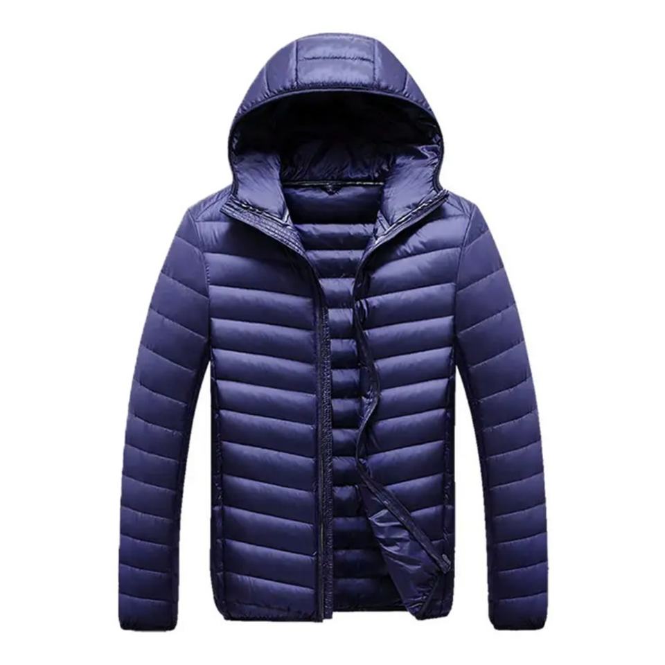เสื้อแจ็คเก็ตดาวน์ผู้ชายแบบสั่งทำพิเศษ น้ำหนักเบา บรรจุขนเป็ด กันลม แบบเย็บติดกัน ทรงทางการ ปิดซิป กันน้ำ