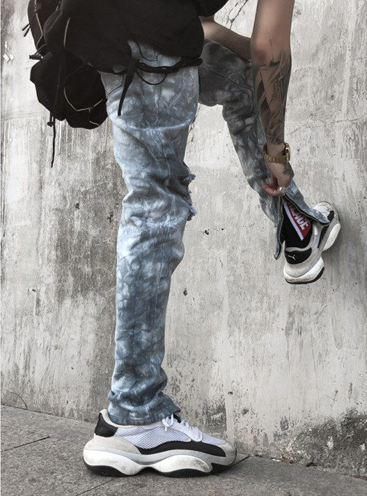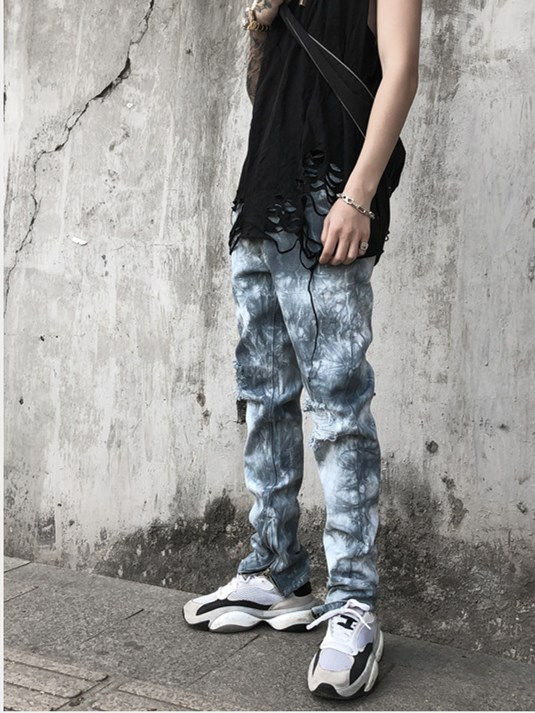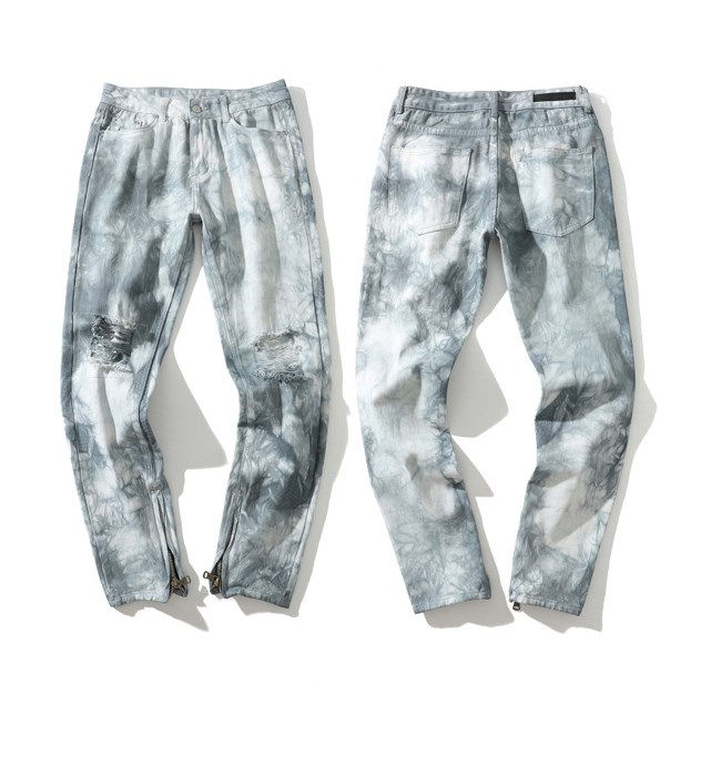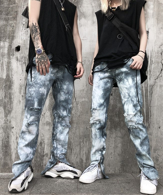 กางเกงยีนส์สำหรับผู้ชายกางเกงยีนส์ทรงตรงผ่าข้างแบบผ่าข้างเอวสูงฟอกสีแบบผ่าข้าง