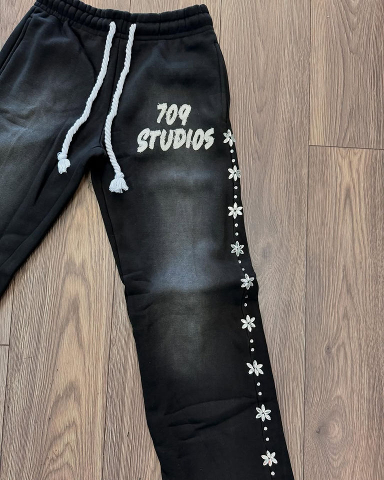 กางเกงผู้ชายแบบกำหนดเองได้กางเกงผ้าพลอยเทียมทรงแบ็กกี้แสงแดดจางสำหรับวิ่งจ๊อกกิ้งฮิปฮอปเอวยางยืดปักลาย
