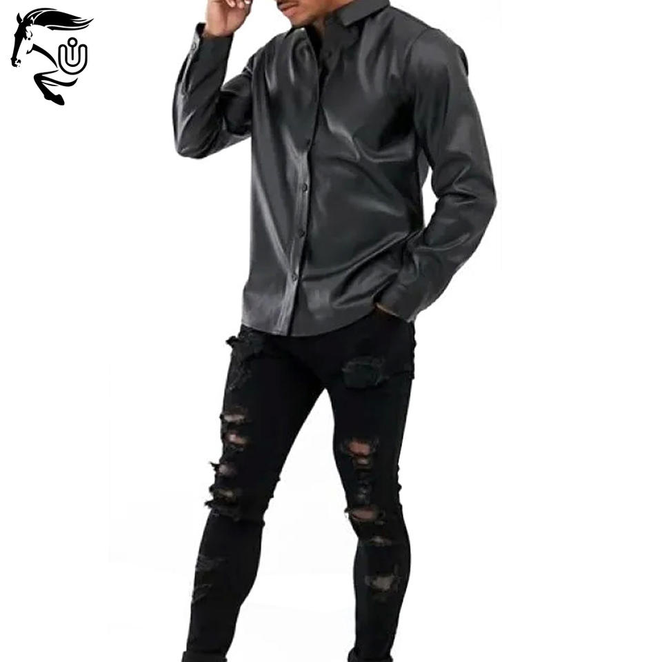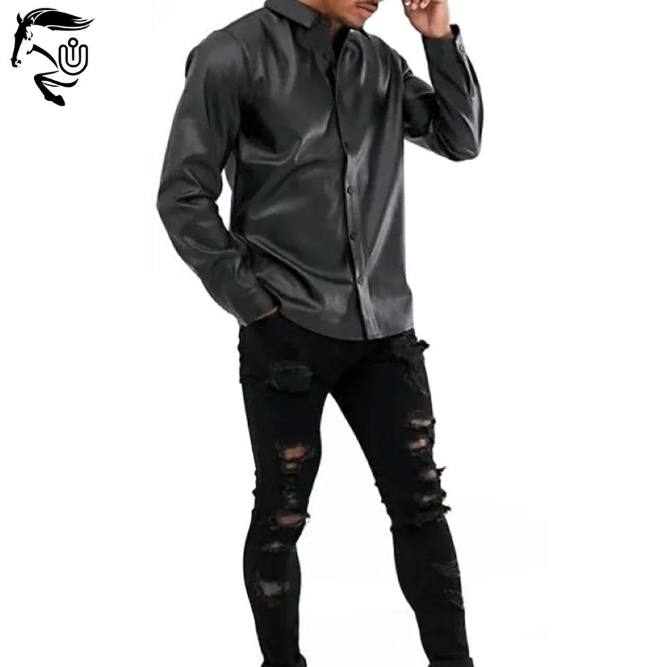 เสื้อหนังแขนยาวของผู้ชายสีดำแบบกำหนดเองมีกระเป๋าติดที่หน้าอกแบบปุ่มเดียวระบายอากาศได้ดีออกแบบตามต้องการ-ขายส่ง OEM