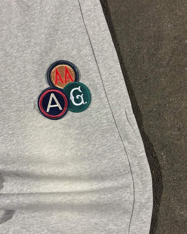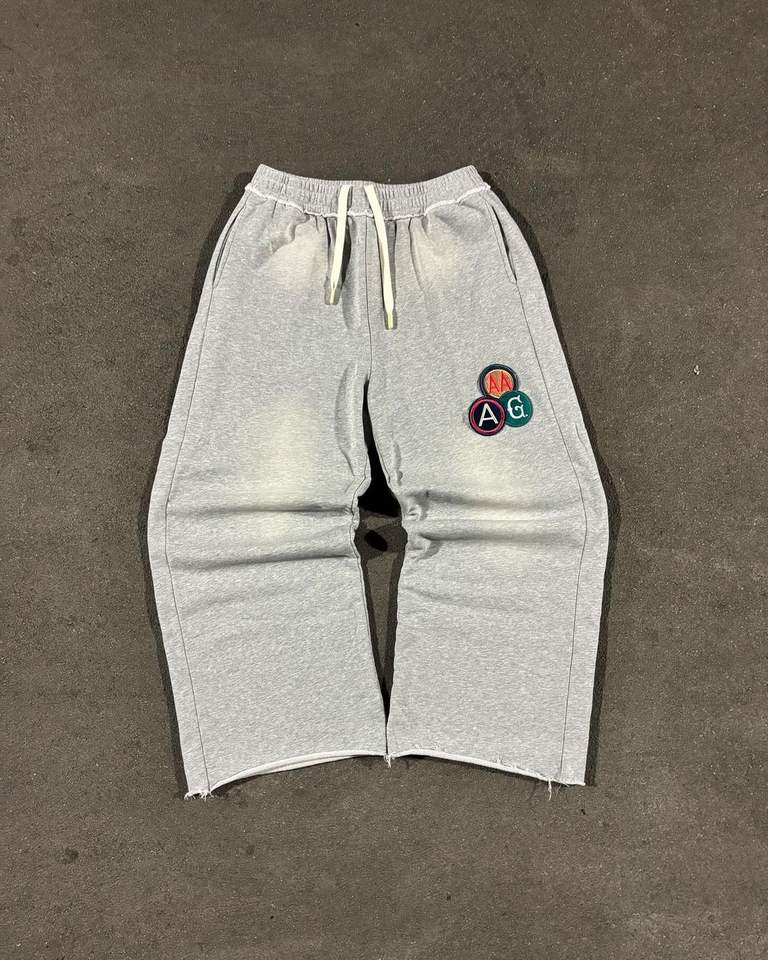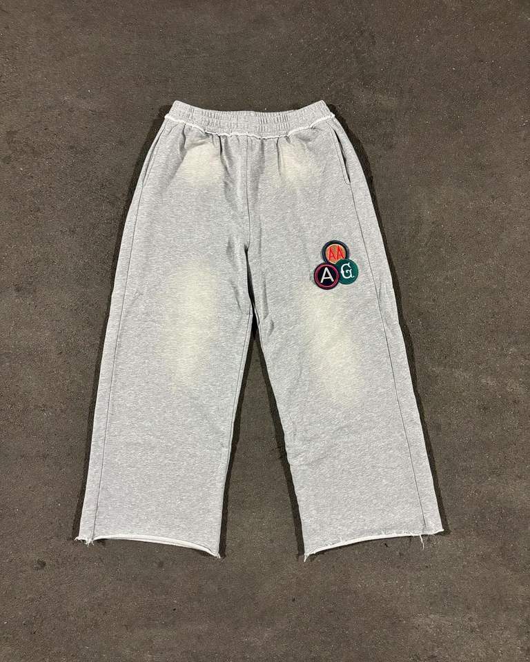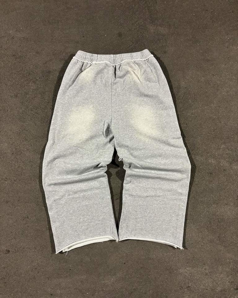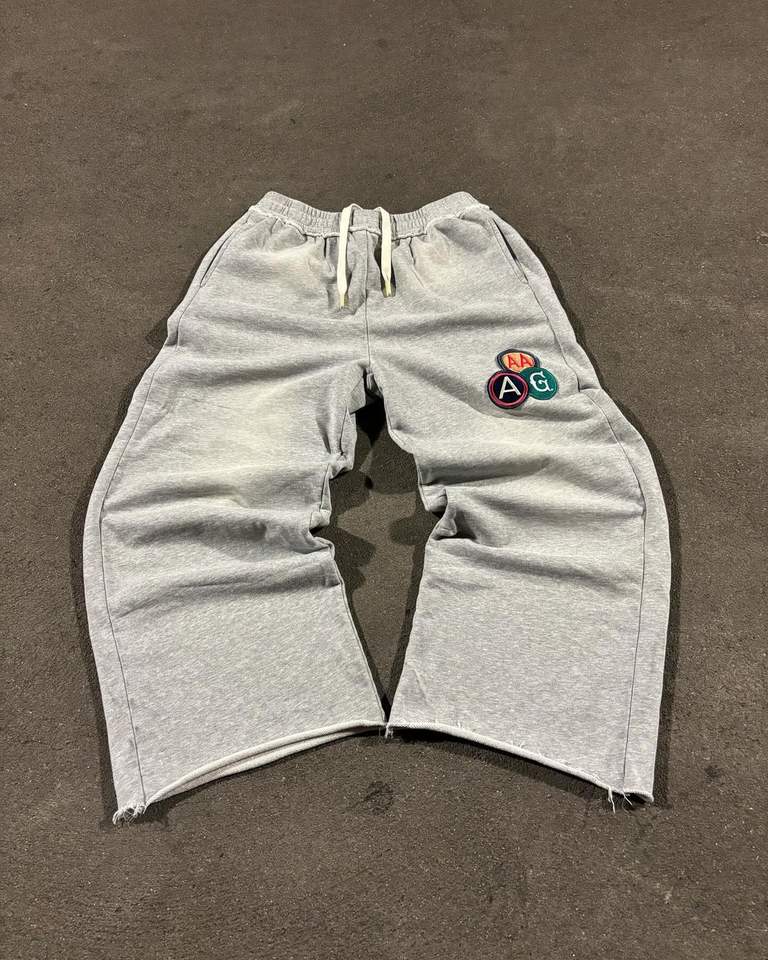 กางเกงวอร์มสีเทาของผู้ชายกางเกงแบบผูกเชือกเอวกลางขาตรงและกางเกงลำลองพิมพ์ลายปะ