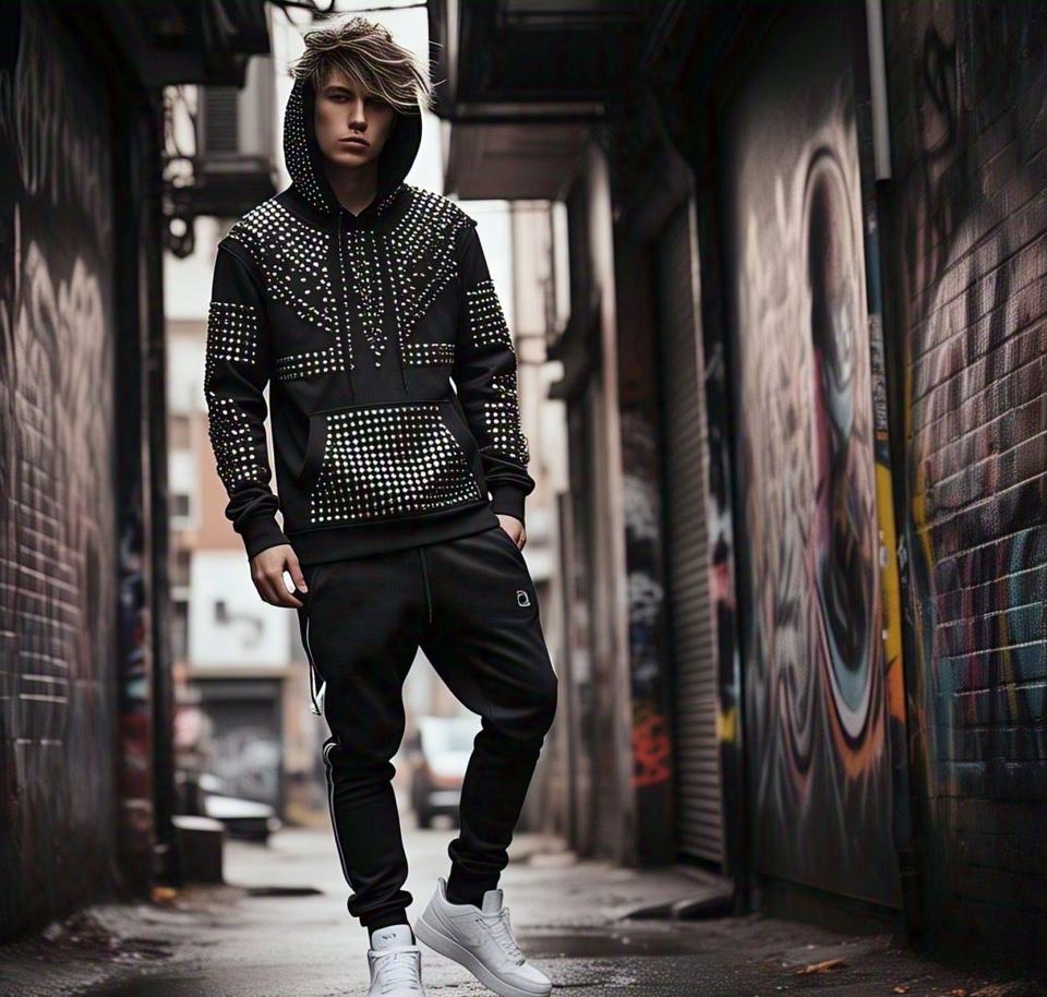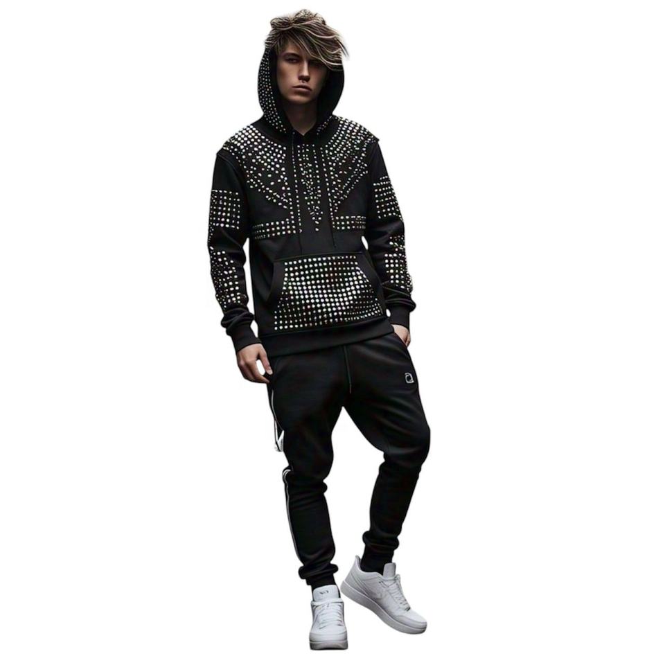 เสื้อฮู้ดดี้ผู้ชายทรงโอเวอร์ไซส์ผ้าฟลีซหนานุ่ม สไตล์สตรีทแวร์ วินเทจ พิมพ์ลายซันเฟด ประดับหมุดและคริสตัล ผ้าฝ้าย 100%