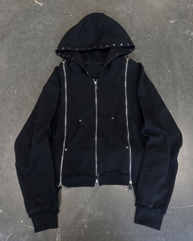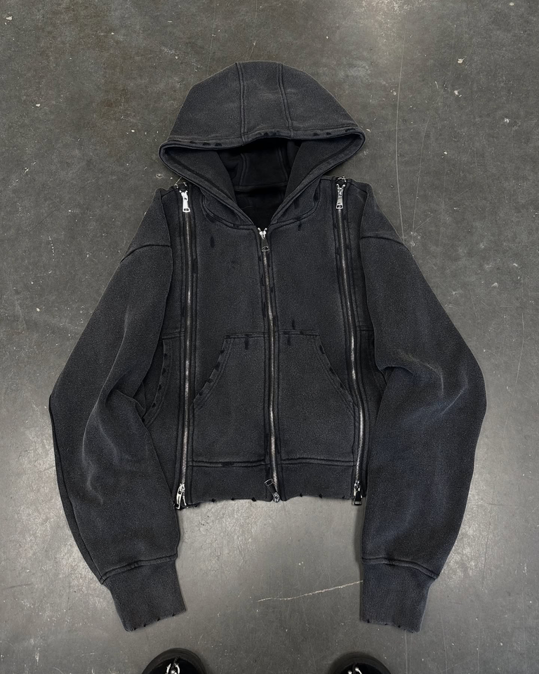 เสื้อฮู้ดซิปสามตัวสำหรับผู้ชายเสื้อล้างกรดวินเทจสีดำซีดดำสกปรกสไตล์บ็อกซี่ขนาดใหญ่ออกแบบได้ตามต้องการ