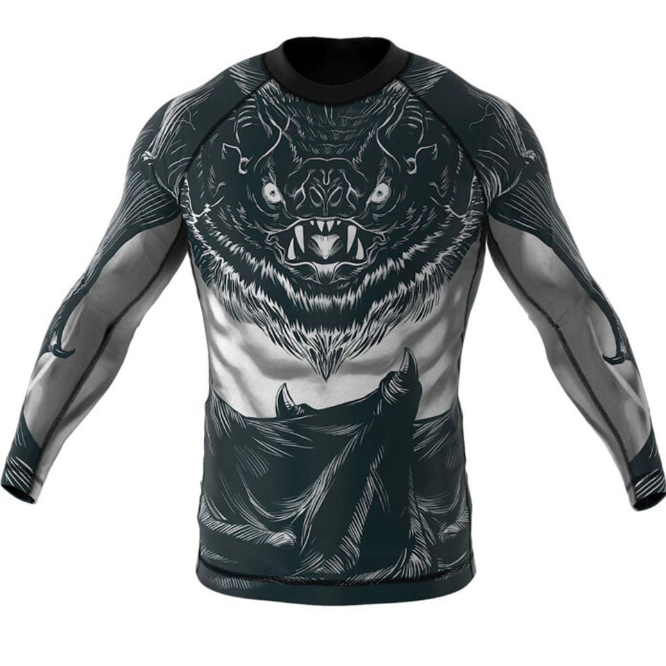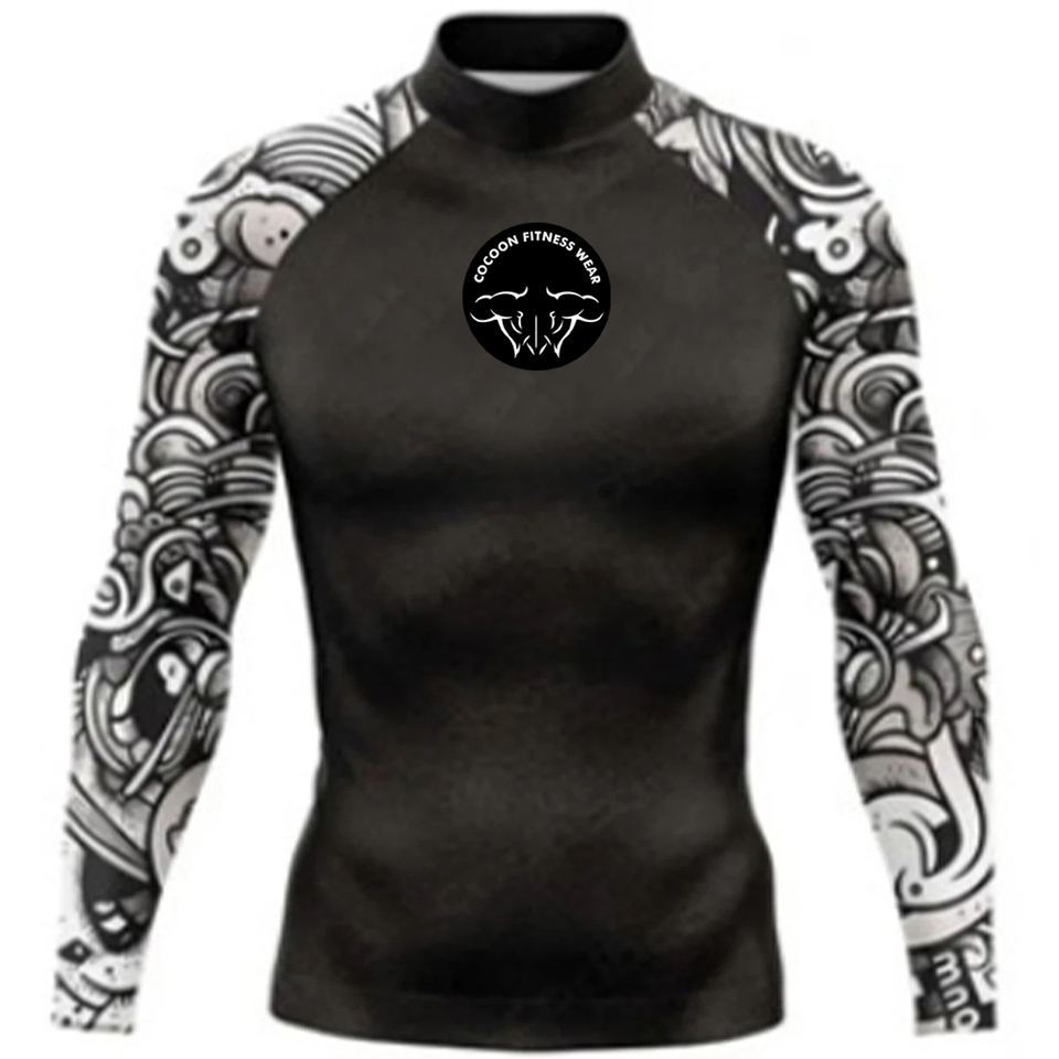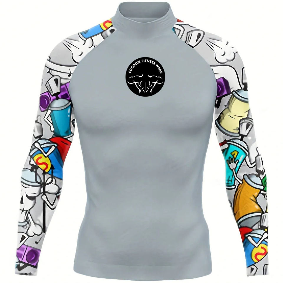เสื้อแรชการ์ดผู้ชายคุณภาพสูง แขนยาว พิมพ์ลายด้วยความร้อน แห้งเร็ว ป้องกันแสงแดด UPF50 ระบายอากาศได้ดี กระชับกล้ามเนื้อ