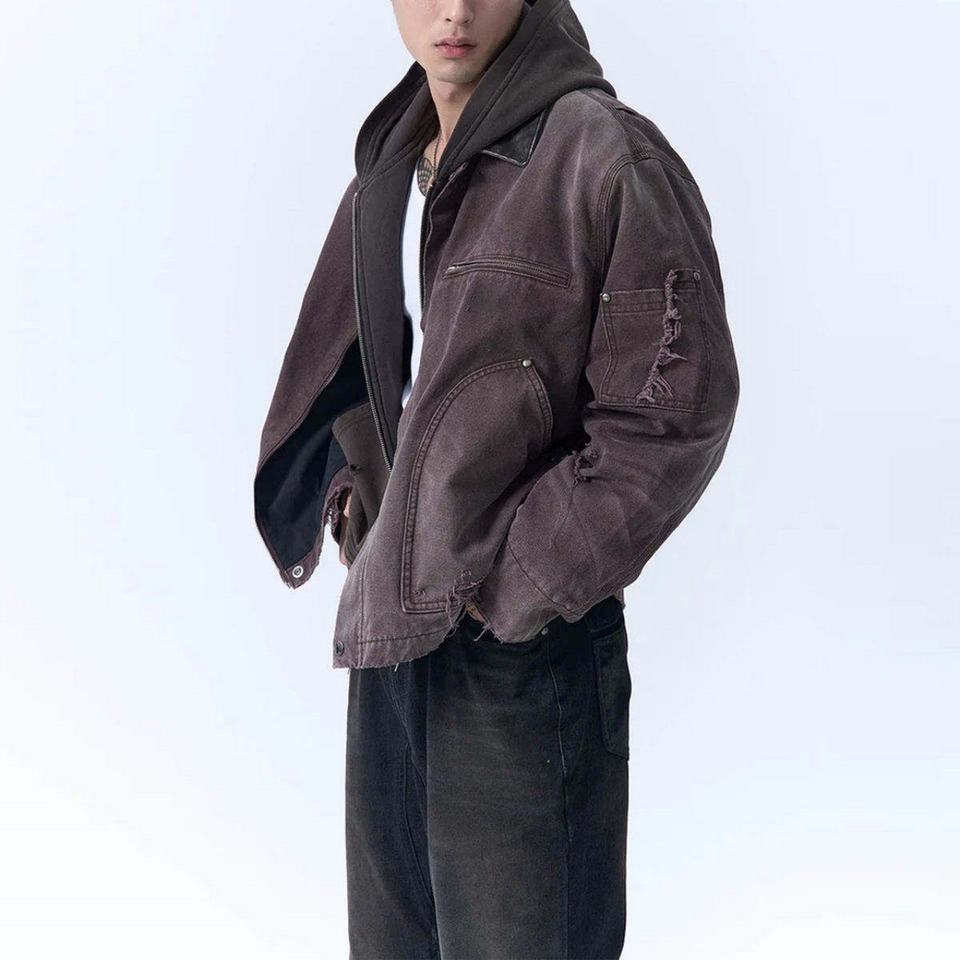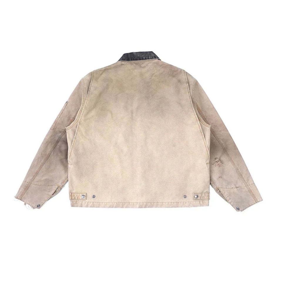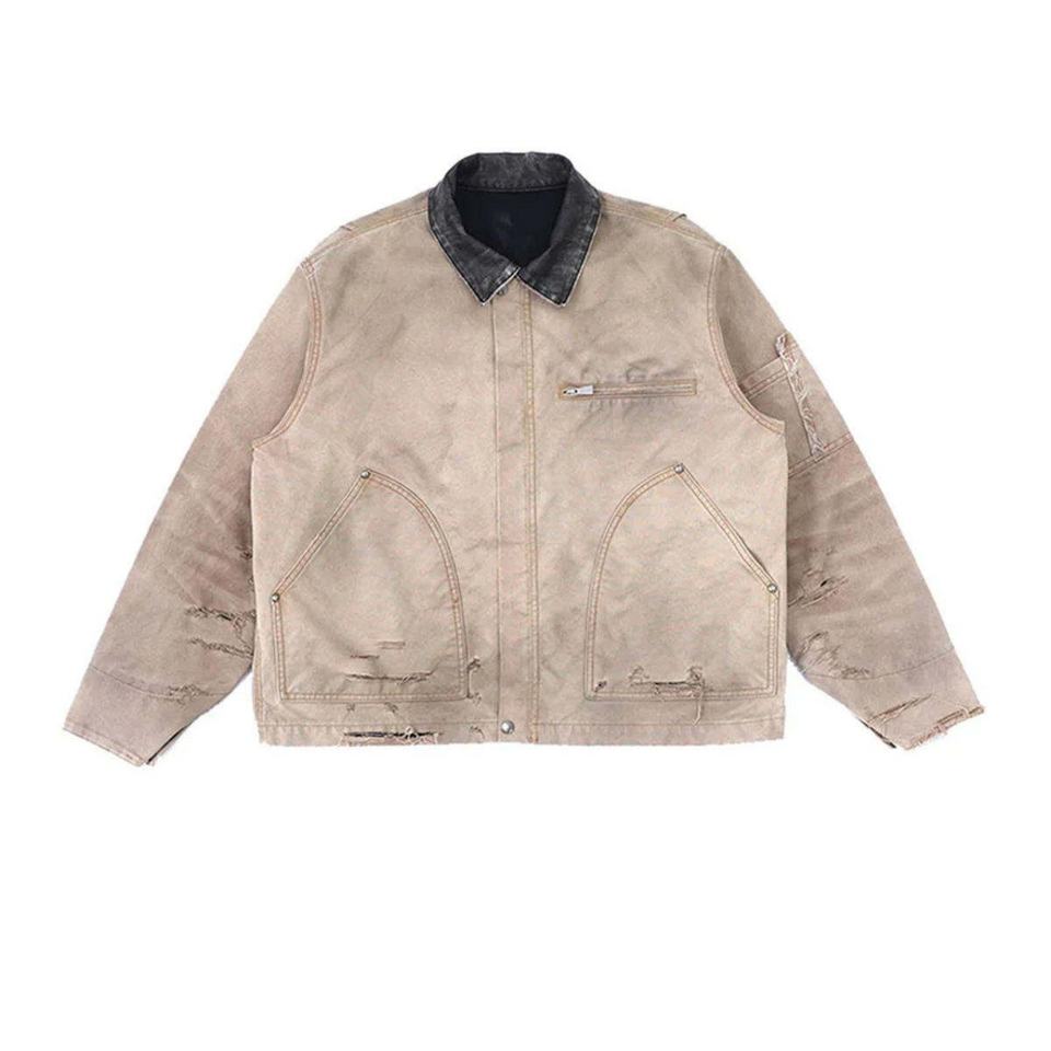 เสื้อแจ็คเก็ตผ้าแคนวาสวินเทจคุณภาพสูงสำหรับผู้ชาย ลุคสตรีทสไตล์ลำลอง ซิปหน้า คอตั้ง ลุคทำเก่า