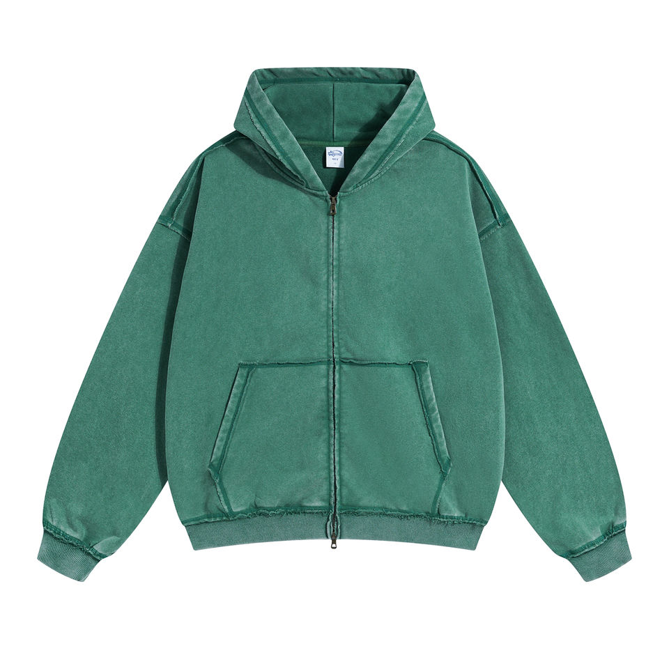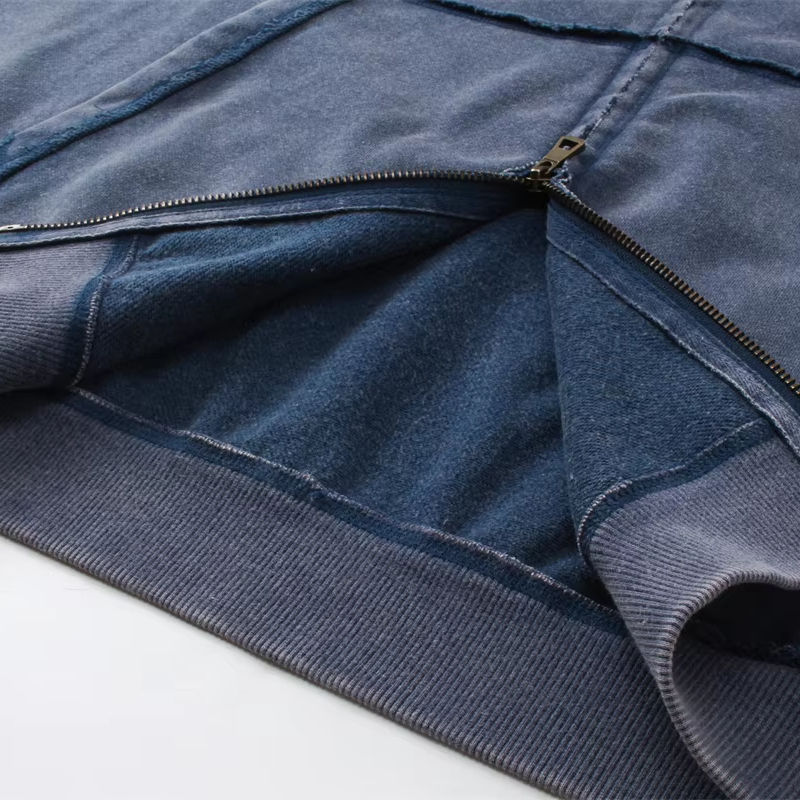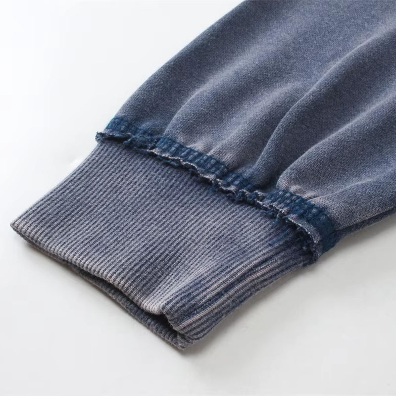 เสื้อสเวตเตอร์มีฮู้ดของผู้ชายแบบสั่งตัดสไตล์สตรีทแวร์ผ้าพัฟฟ์พิมพ์ลายวินเทจผ้าซักกรดสีเทา