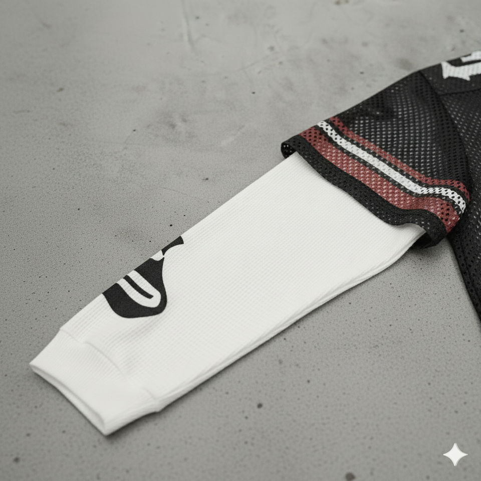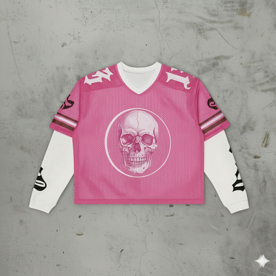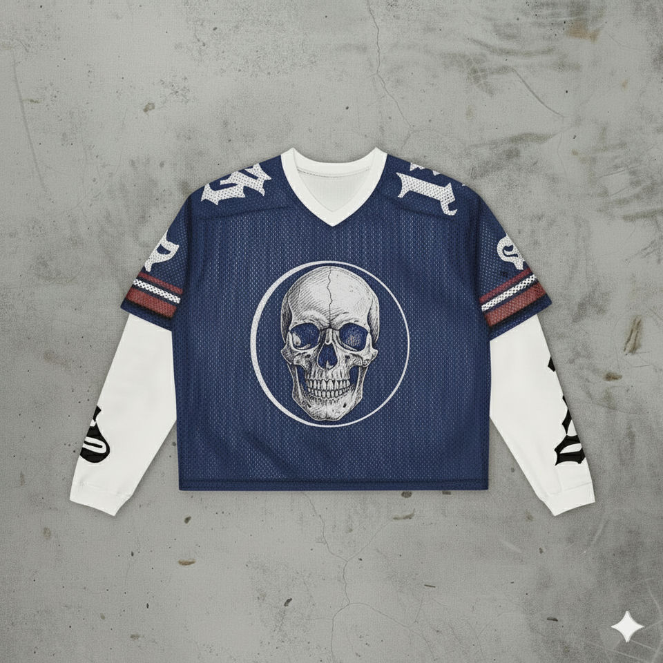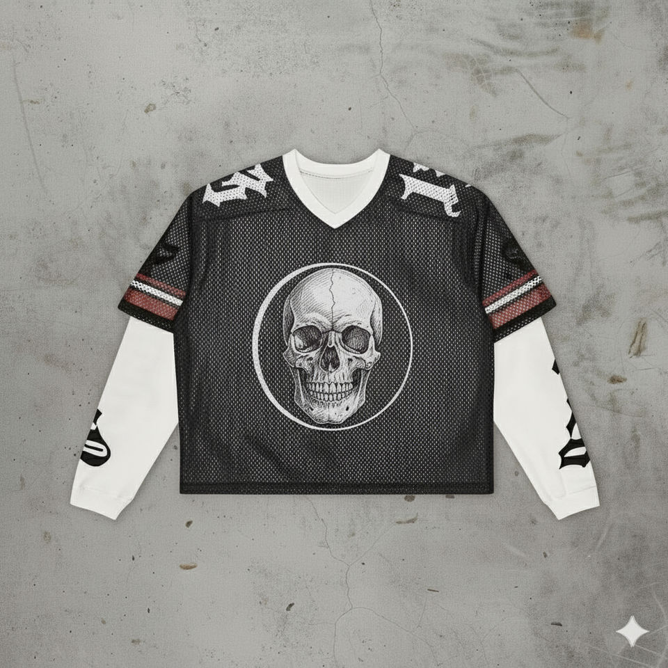 เสื้อยืดแขนยาวผู้ชายแบบมีเลเยอร์ลายกราฟิกหัวกะโหลก ผ้าตาข่ายวาฟเฟิล ทรงบ็อกซี่ ครอป สตรีทแวร์ รับผลิตแบบ OEM ขายส่งจากโรงงาน