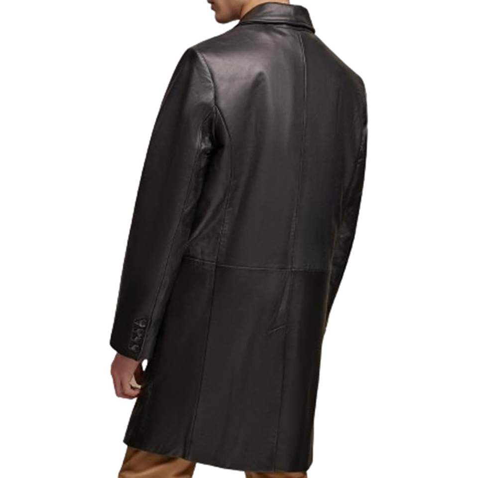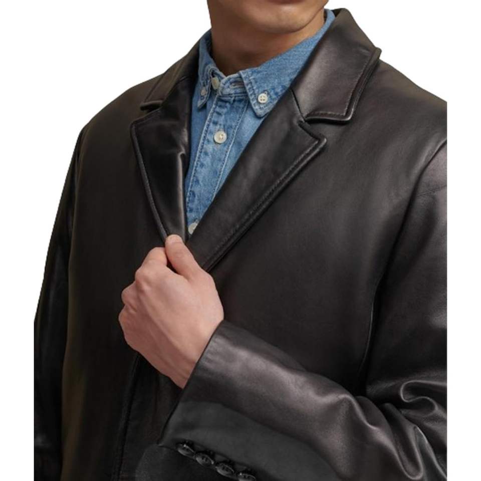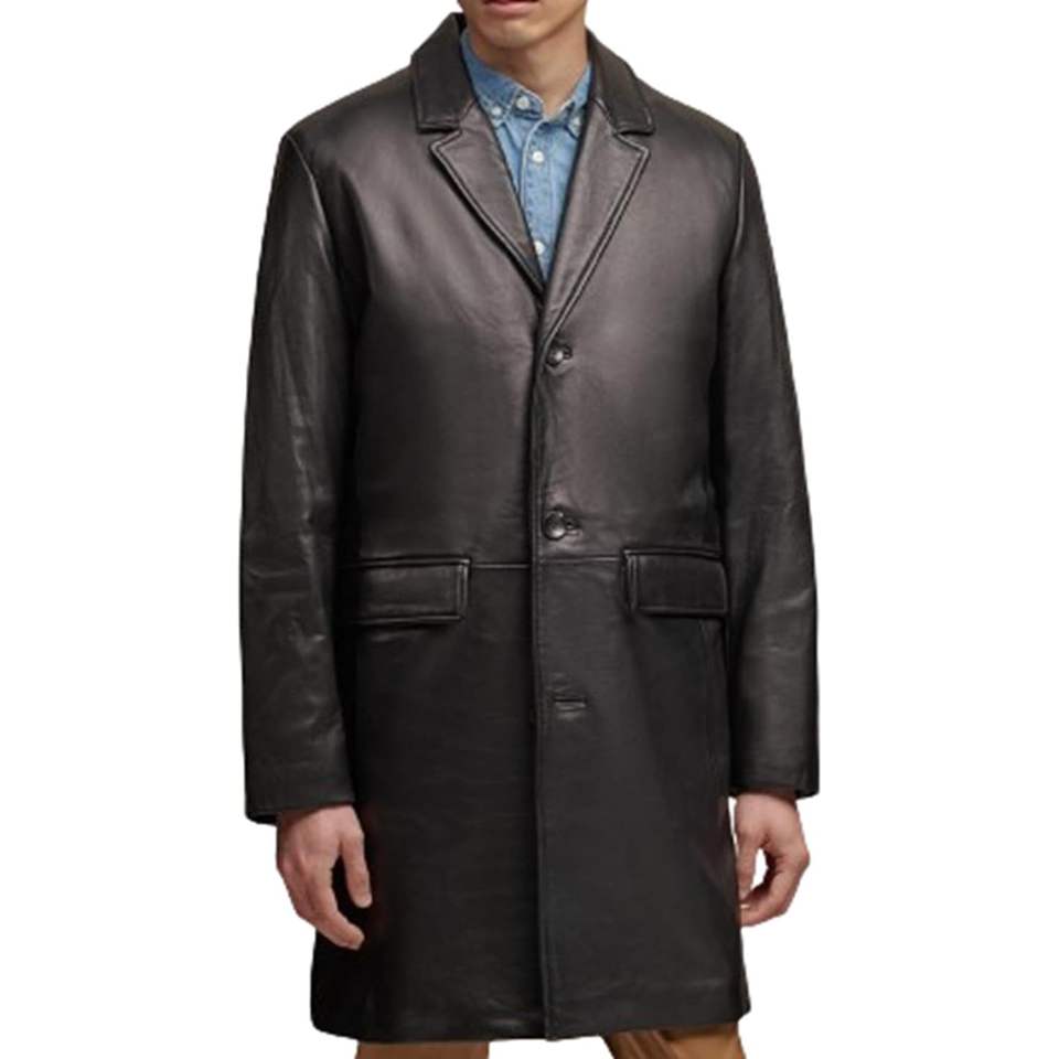 เสื้อโค้ทหนังแท้ผู้ชายทรงยาว กระดุมสองแถว ปกแบบน็อตเชด หนังวัวแท้ขัดเงา สไตล์คลาสสิก