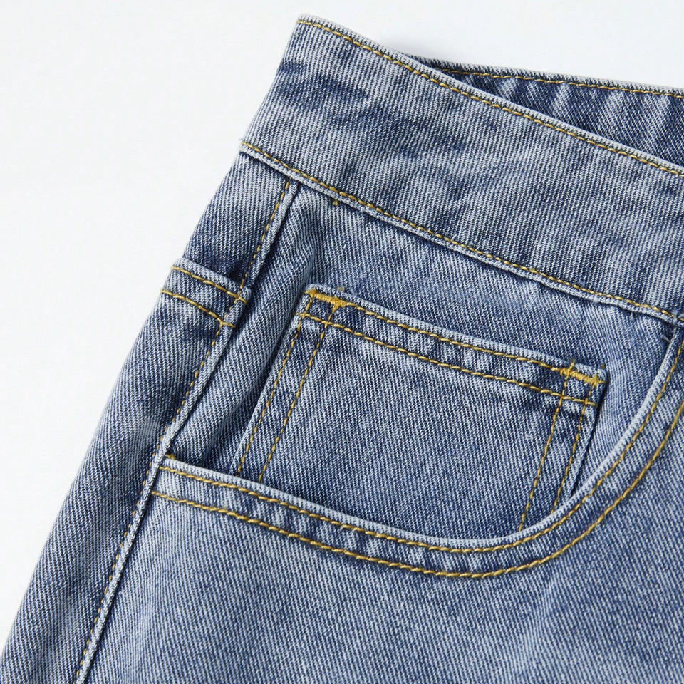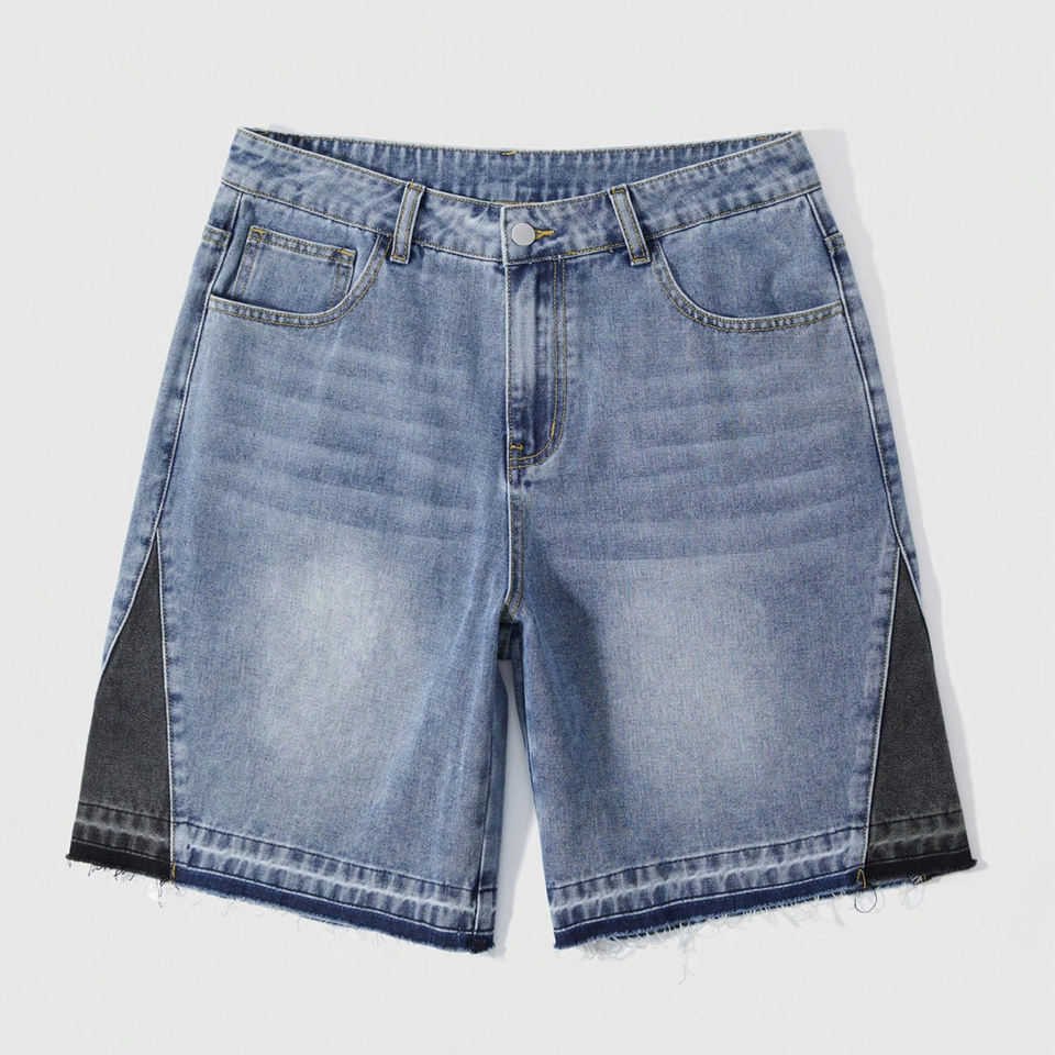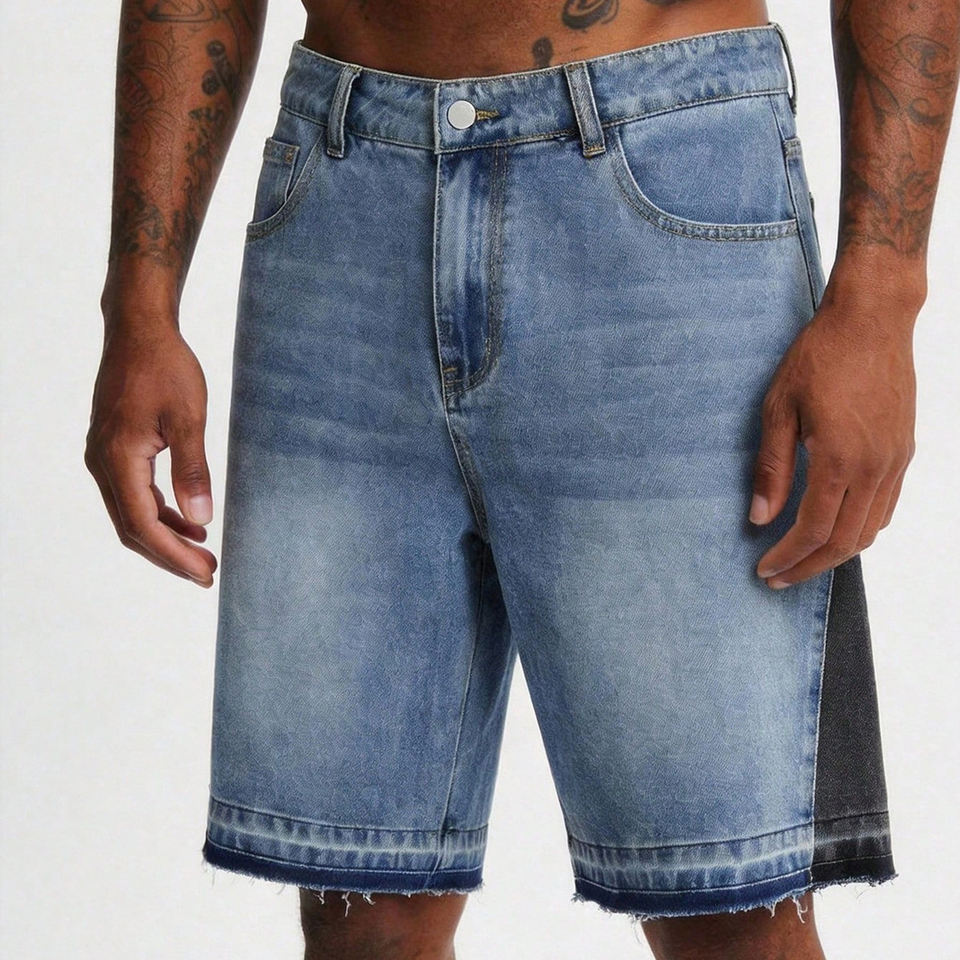 กางเกงขาสั้นผู้ชายผ้าเดนิมสีอ่อนแบบมีแผ่นตัดต่อ ดีไซน์ขอบดิบ สไตล์ลำลองสำหรับฤดูร้อน สตรีทแวร์ ความยาวระดับเข่า ผลิตจากผ้าฝ้ายออร์แกนิก กำลังเป็นที่นิยม