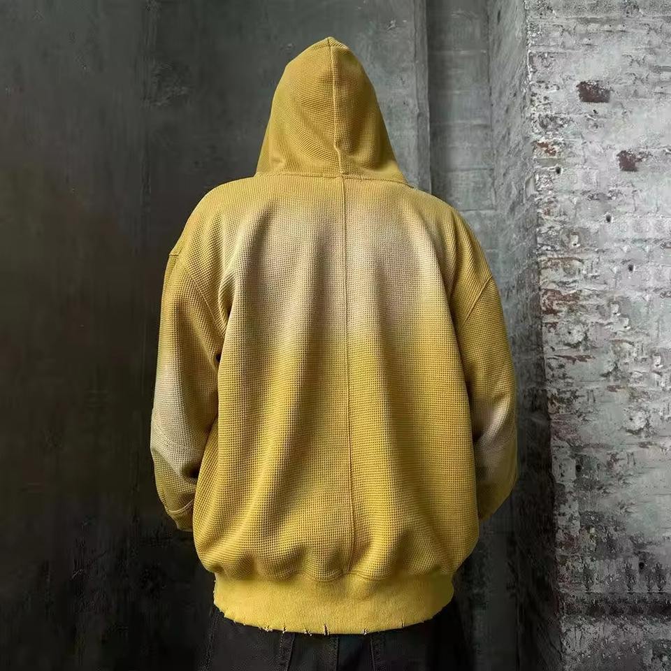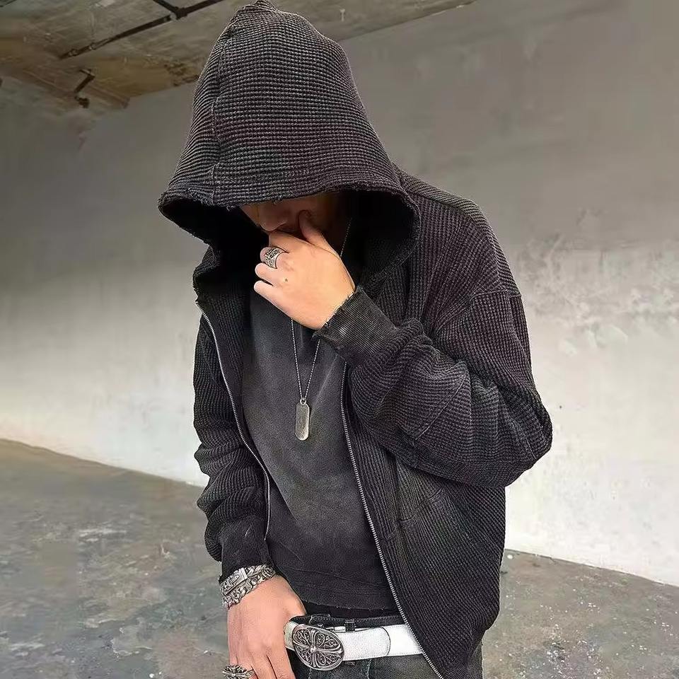 เสื้อฮู้ดผู้ชายแบบใหม่ ผ้าวาฟเฟิล ทอแบบพิเศษ ซักฟอกสไตล์วินเทจ พ่นสีแบบแอซิดวอช มีซิปและฮู้ด