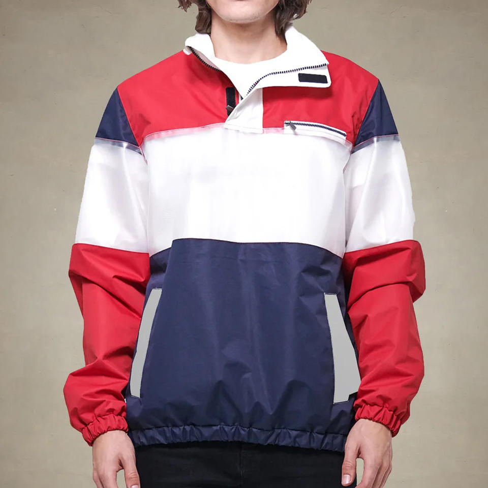 เสื้อแจ็กเก็ตกันลมสวมหัวสำหรับผู้ชายเสื้อกันลมสวมหัวผ้าไนลอนแบบคอตั้งครึ่งซิปดีไซน์บล็อกสีตาข่ายกันน้ำสไตล์ Anorak