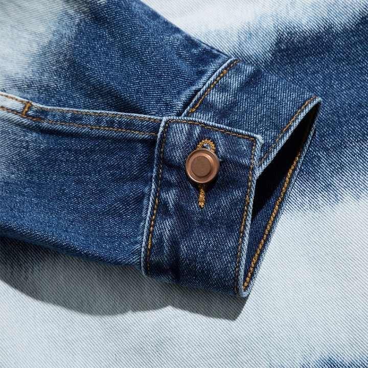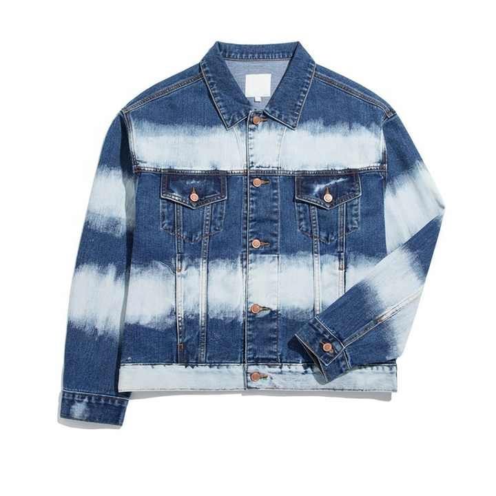 แจ็กเก็ตผ้ายีนส์มัดย้อมผ้าคอนทราสต์ของผู้ชายเสื้อแจ็กเก็ตผ้ายีนส์ระบายอากาศได้แบบคลาสสิกแขนปกติขายส่ง