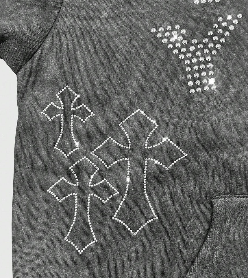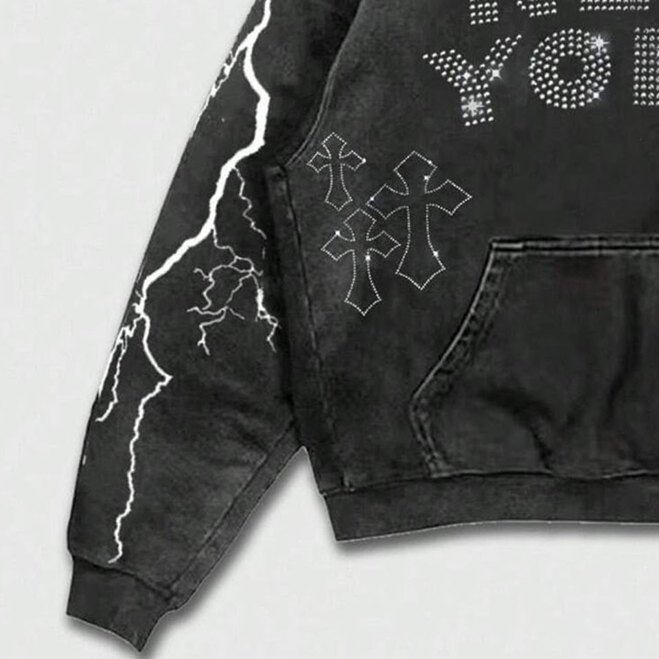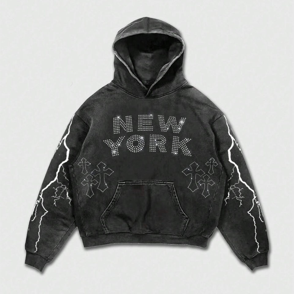เสื้อฮู้ดดี้โอเวอร์ไซส์พิมพ์ลายตัวอักษรและกากบาทประดับเพชรคุณภาพสูงสำหรับผู้ชาย สไตล์สตรีทแวร์ ทรงหลวมไหล่ตก